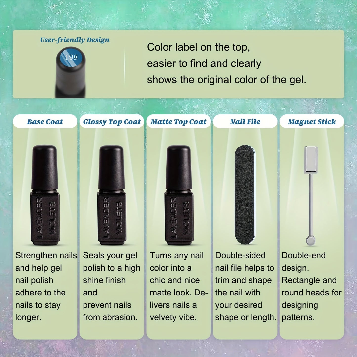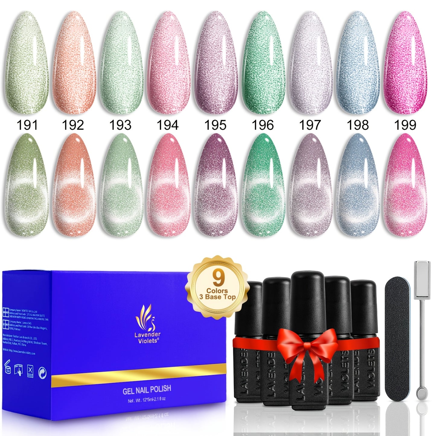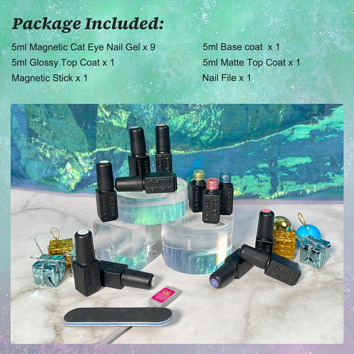 14 Pcs 9 Colors Cat Eye Gel Nail Polish Kit with 9 Colors Coat, 3 Bottles of Base Top Matt Top Coat and Nail File Magnet for Soak-off UV LED Gel Nail Art Design