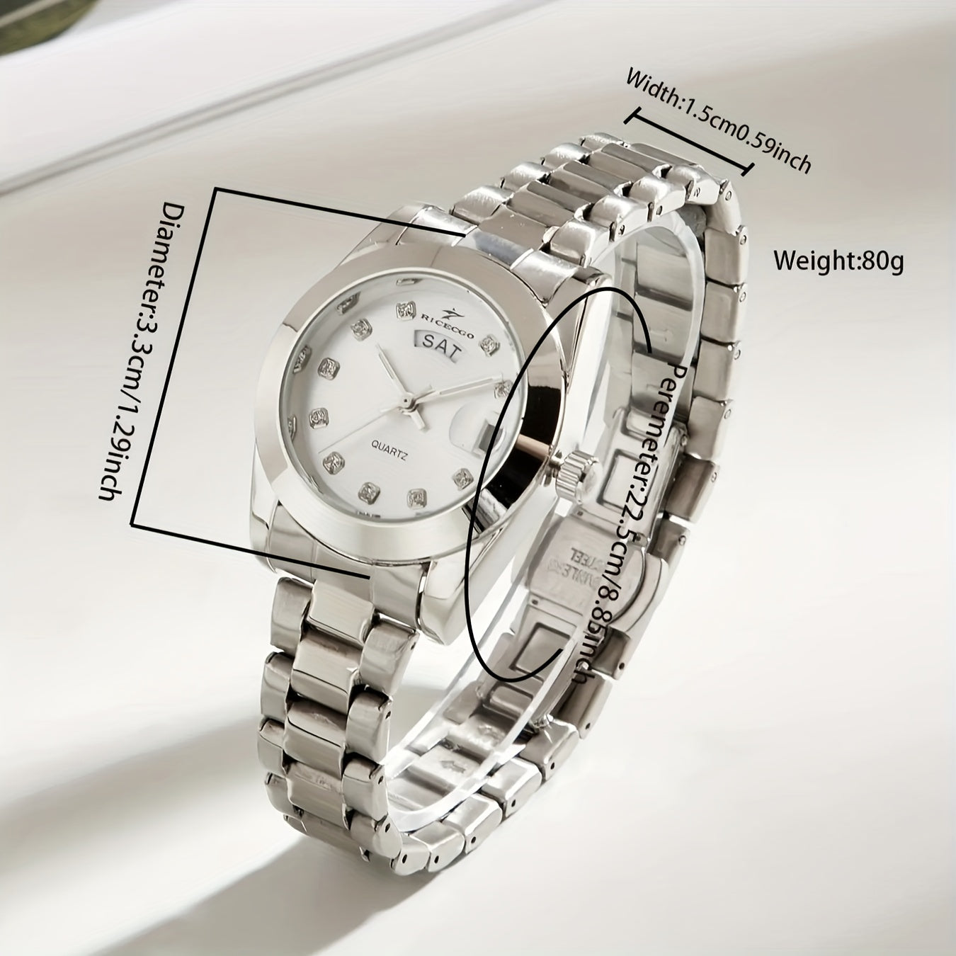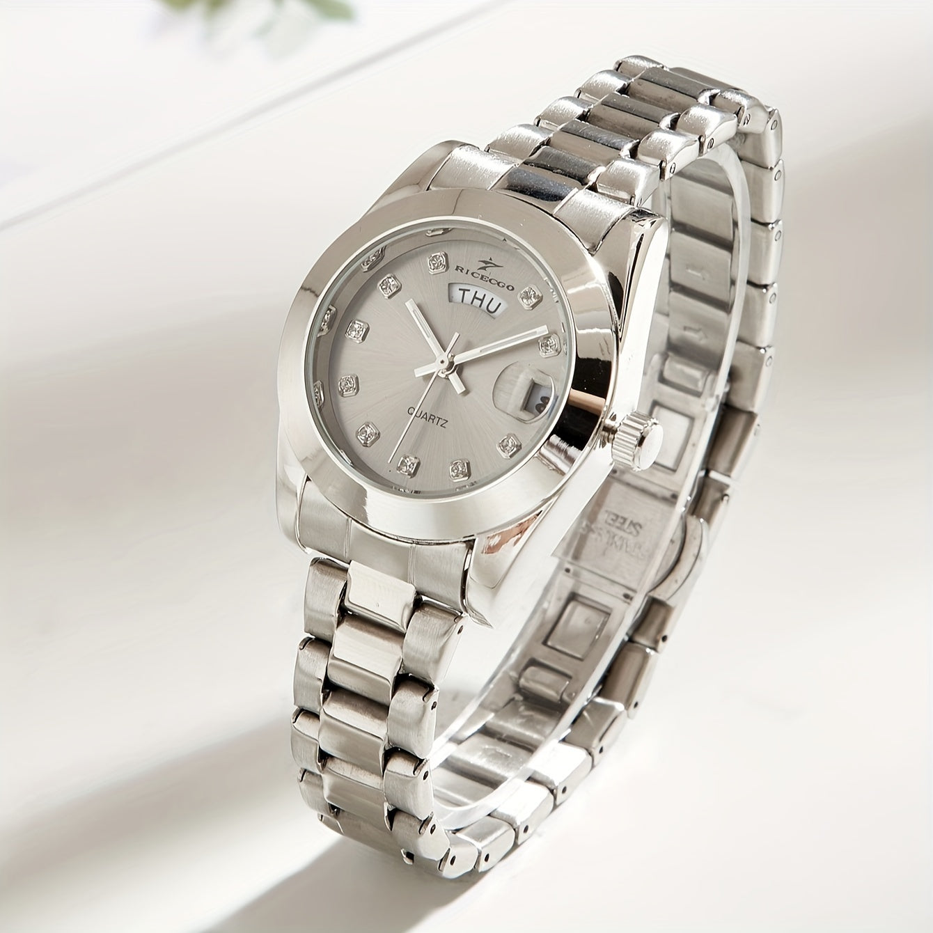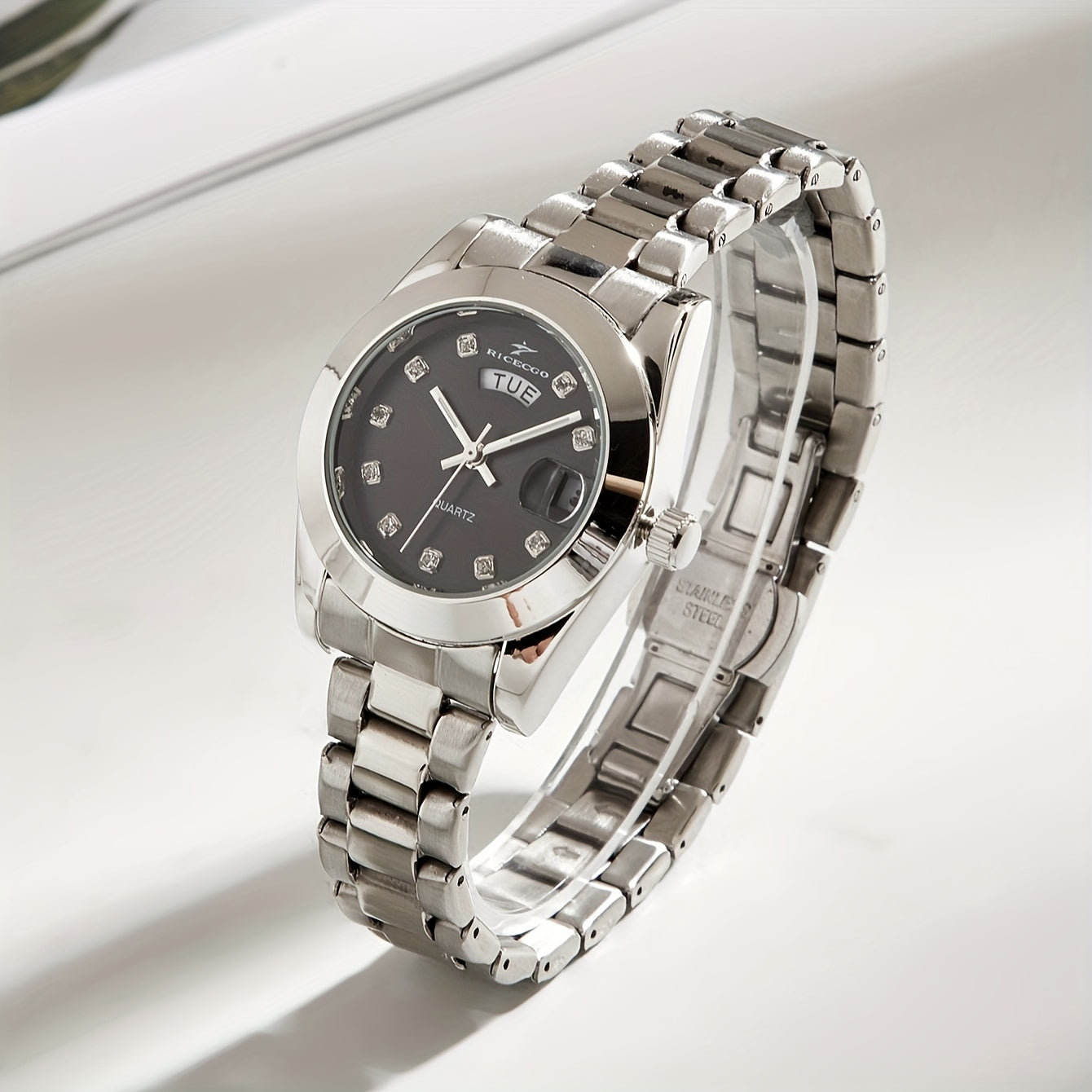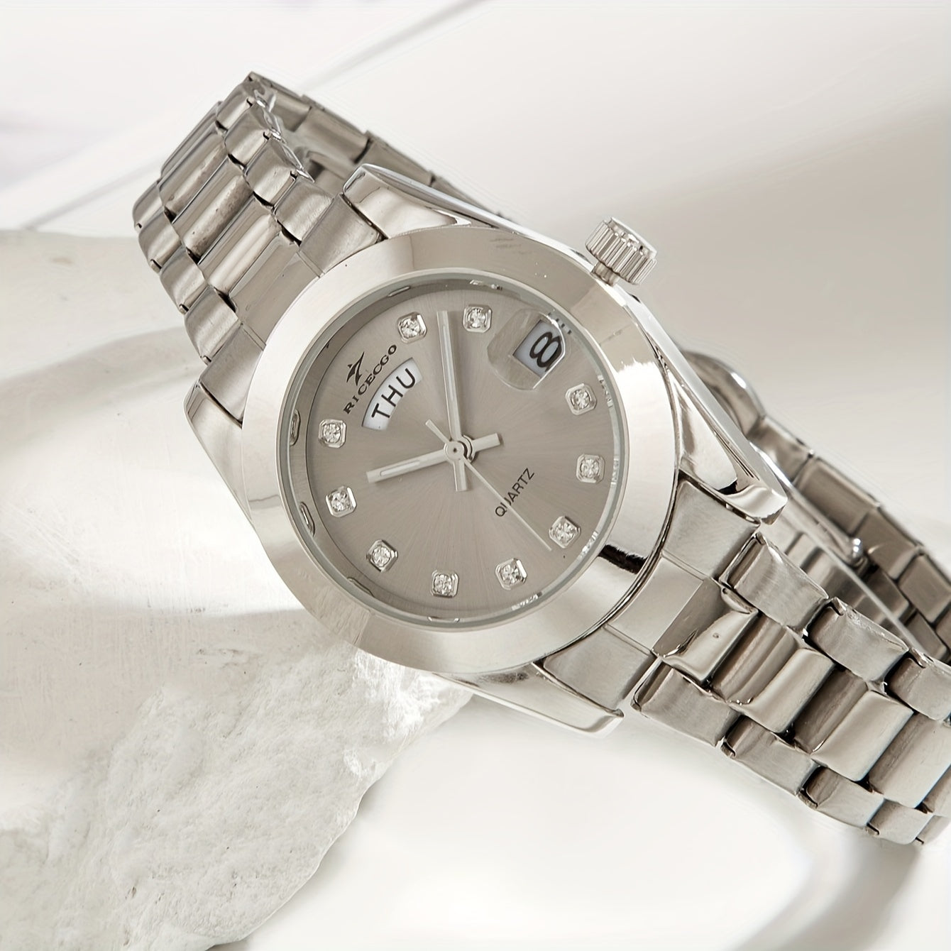 [1pc Elegant Quartz Business Watch] 1pc RICECGO Women'S Fashion Business Style Round Zinc Alloy Case Quartz Watch with Stainless Steel Band, Non-Rechargeable Button Battery - Elegant Daily Wear Wristwatch Gift