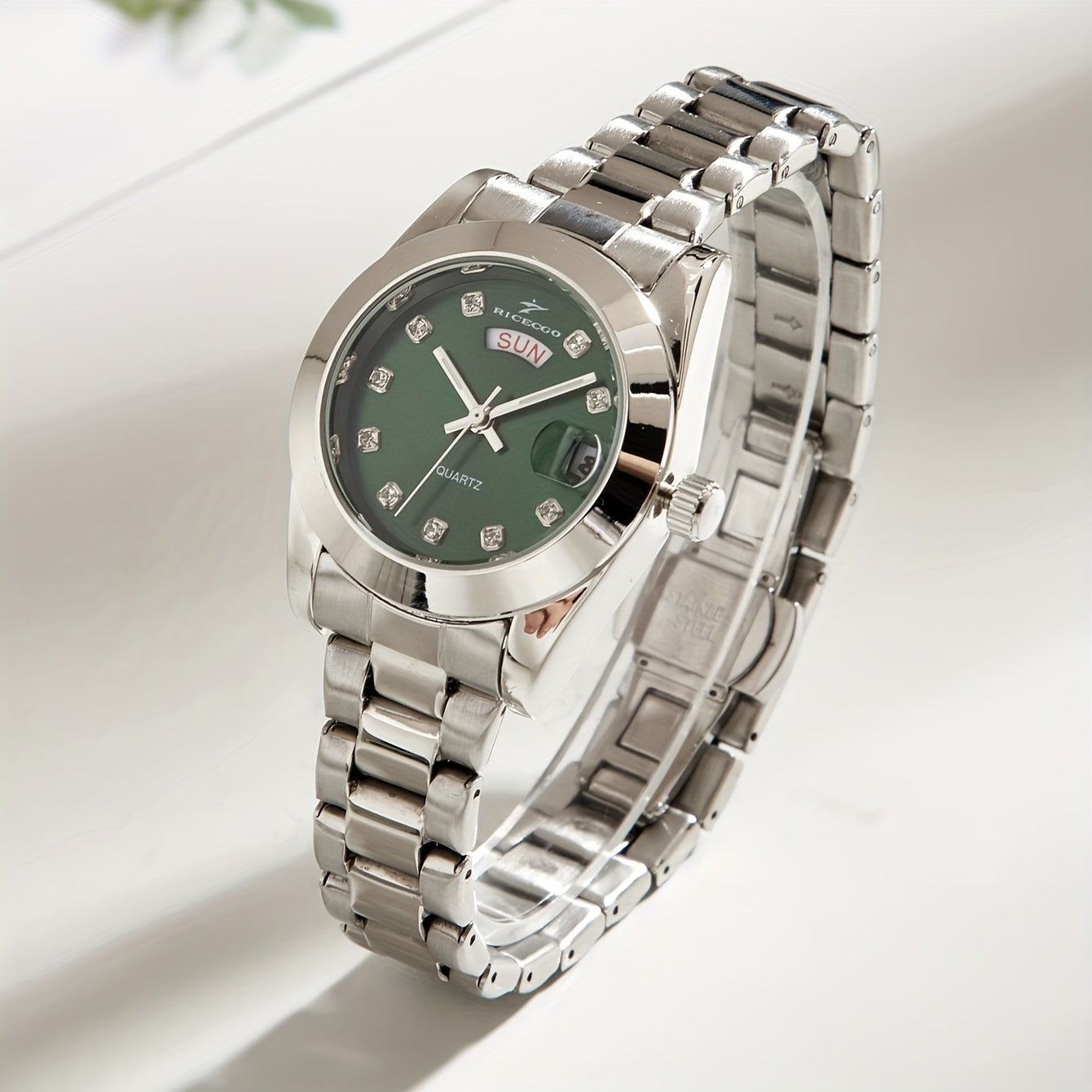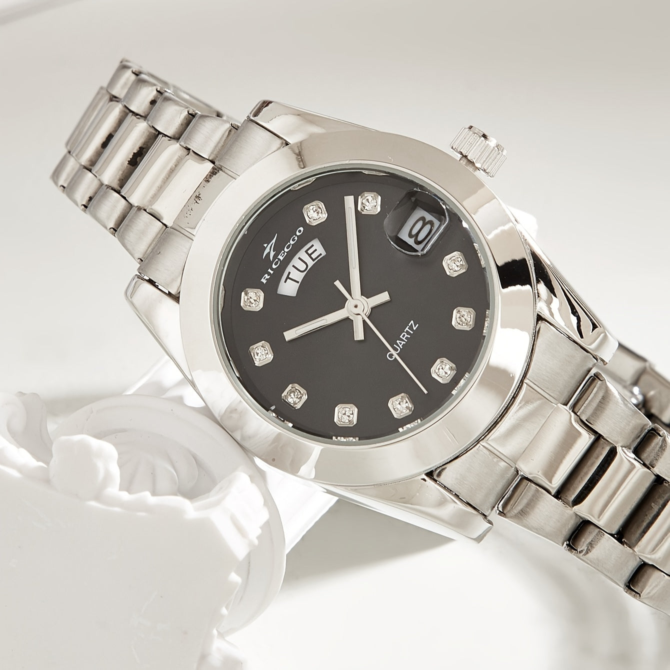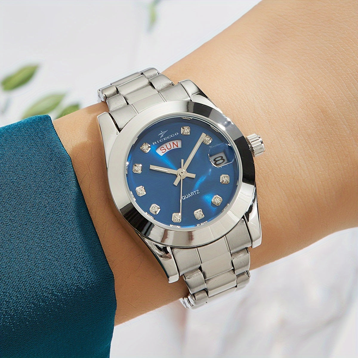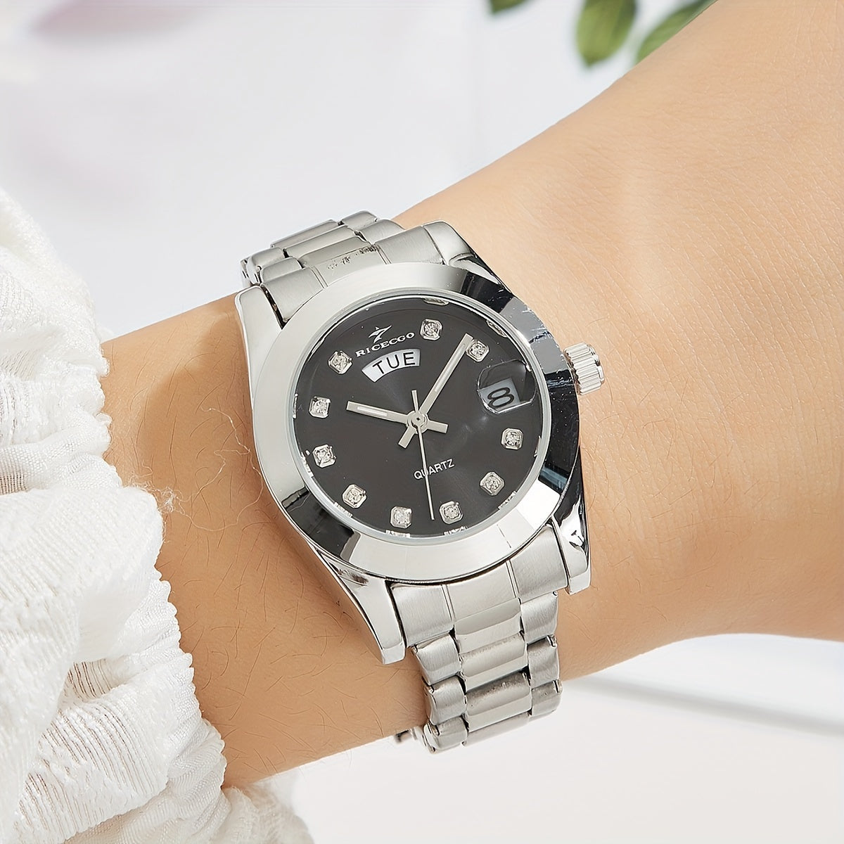[1pc Elegant Quartz Business Watch] 1pc RICECGO Women'S Fashion Business Style Round Zinc Alloy Case Quartz Watch with Stainless Steel Band, Non-Rechargeable Button Battery - Elegant Daily Wear Wristwatch Gift