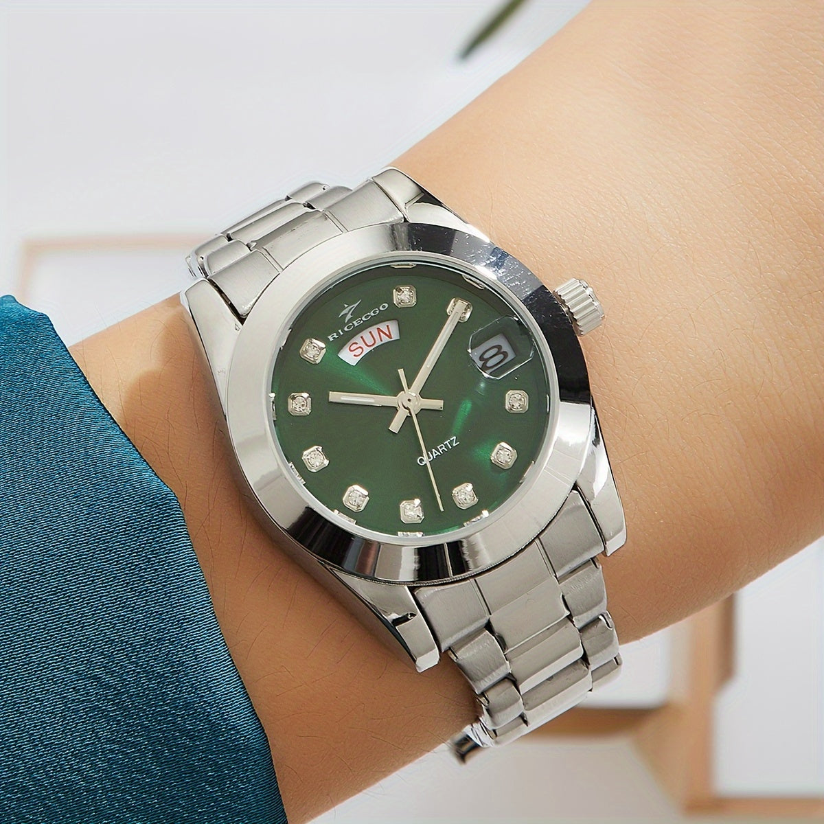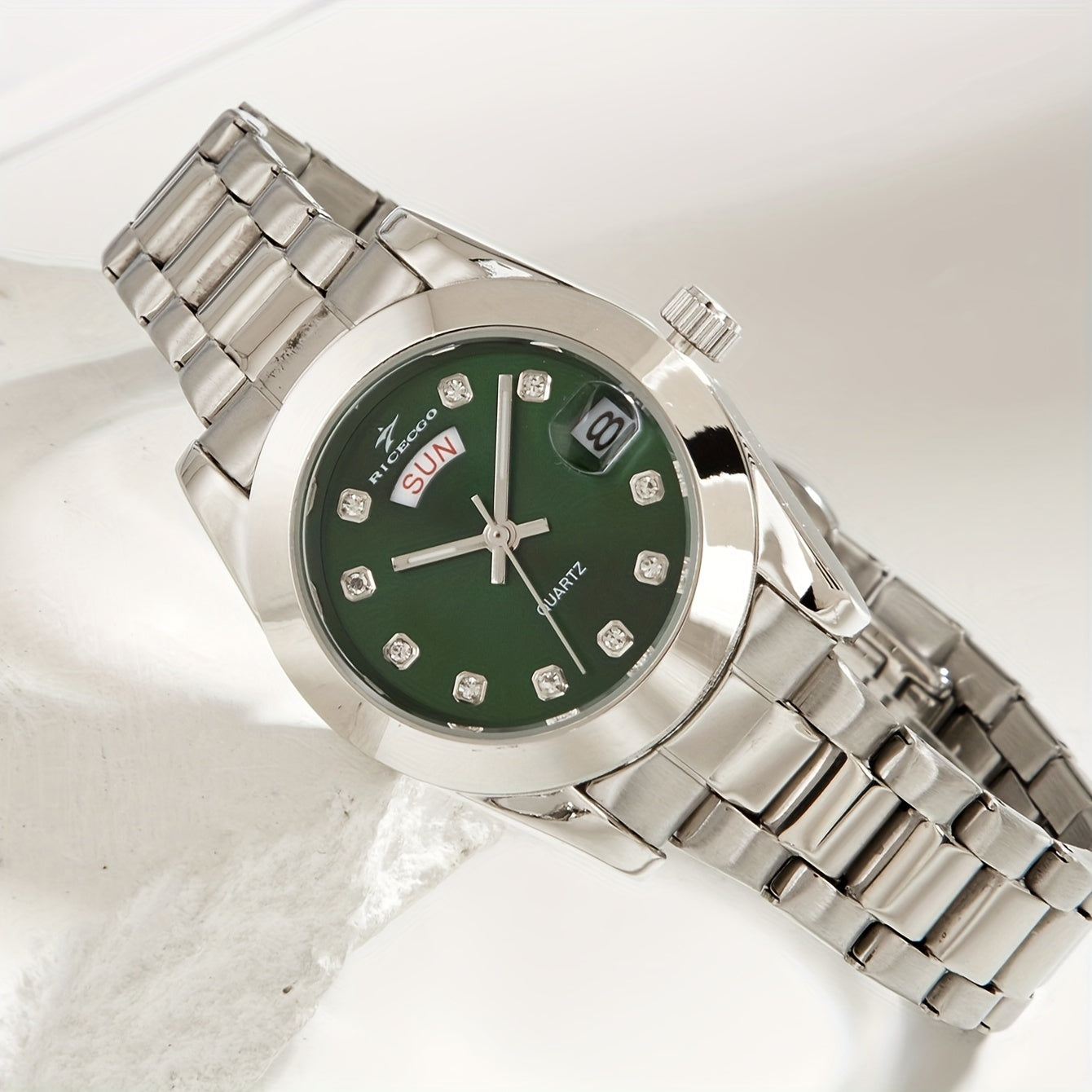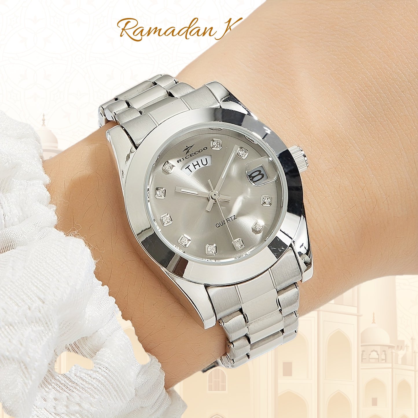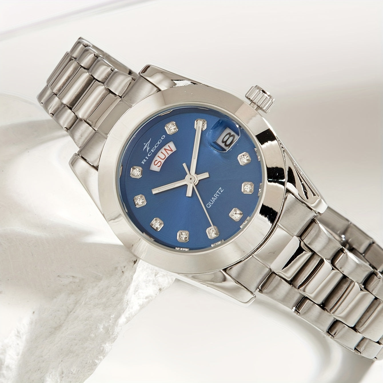[1pc Elegant Quartz Business Watch] 1pc RICECGO Women'S Fashion Business Style Round Zinc Alloy Case Quartz Watch with Stainless Steel Band, Non-Rechargeable Button Battery - Elegant Daily Wear Wristwatch Gift