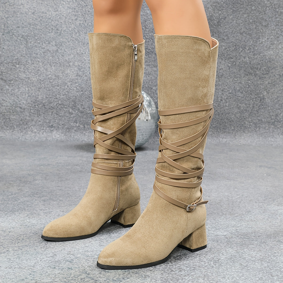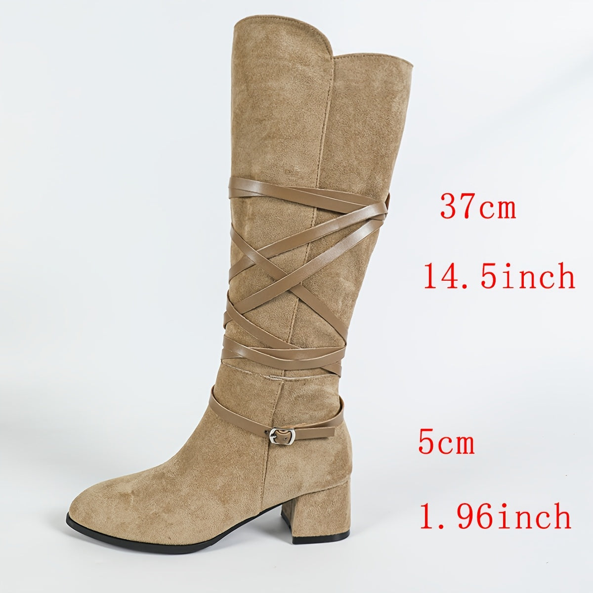 1pr Elegant Knee-High Riding Boots for Women - Mid-Calf Combat Style with Lace-Up Detail, Round Toe, Chunky Heel, Zip Closure, Faux Suede and TPU Sole, Comfortable for All Seasons