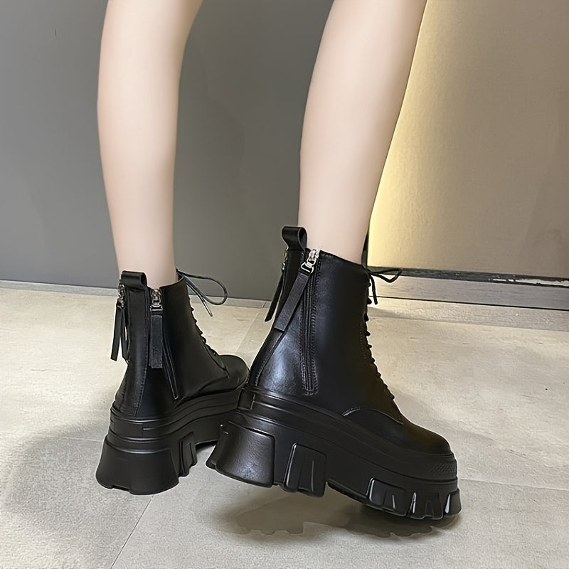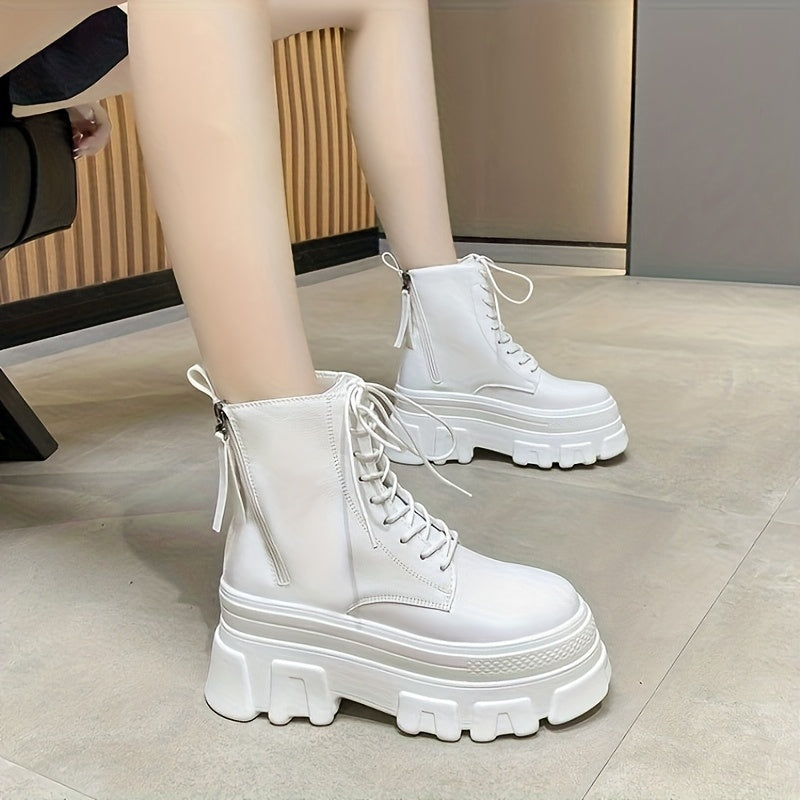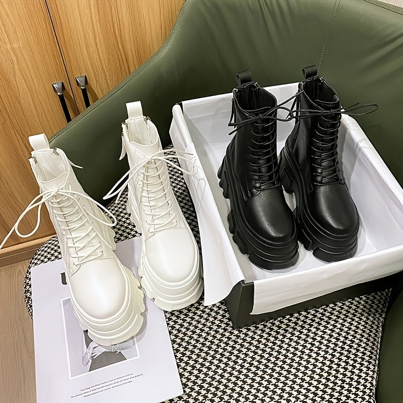 2025 New Fashion British Style High-Top Lace-Up Platform Boots for Women - Round Toe Chunky Heel, Synthetic Cover & Rubber Sole, Black & White Casual Mid-Calf Boots with Chain Strap Design, High Heel Boots, Versatile Footwear, Durable Construction