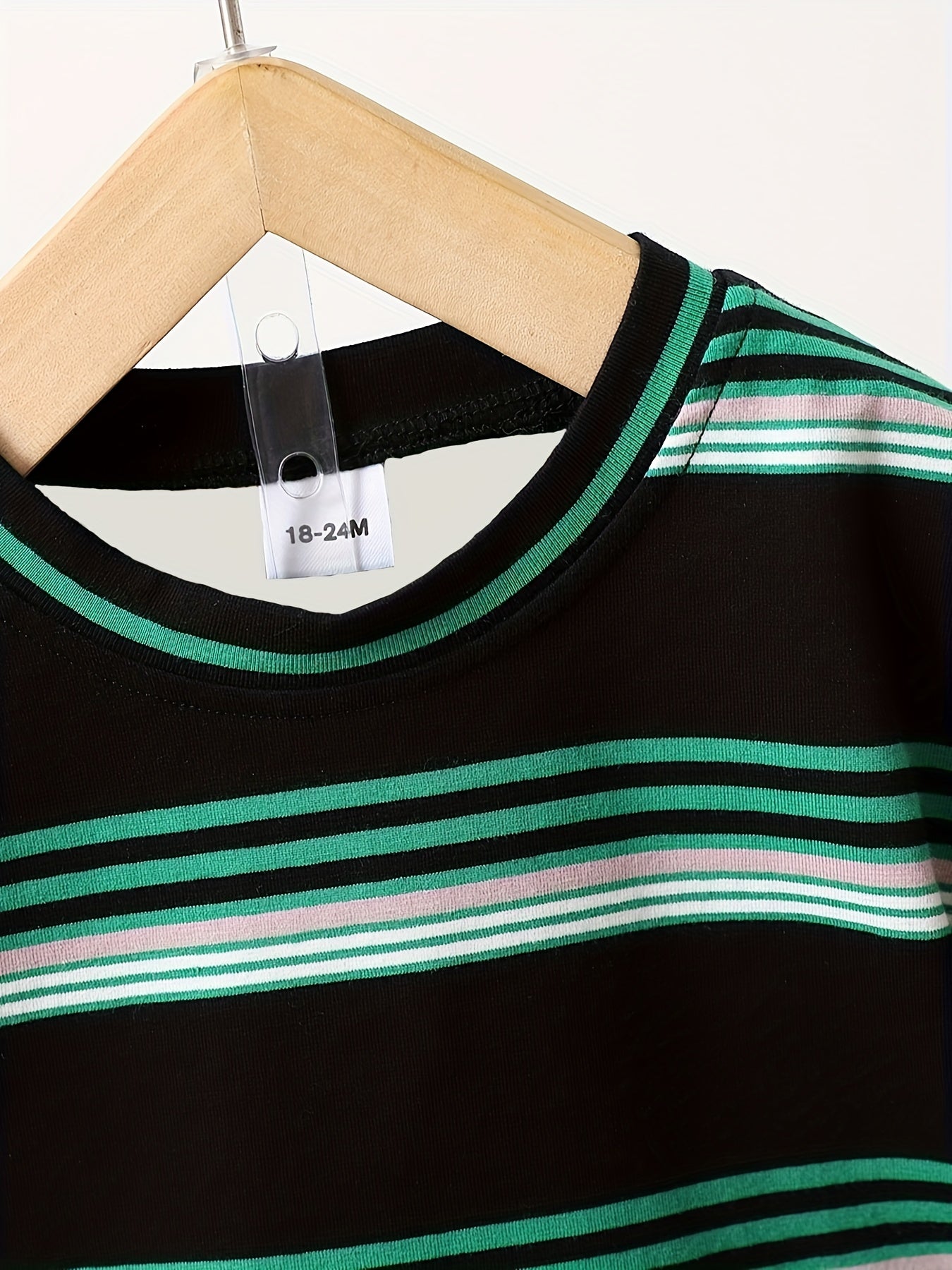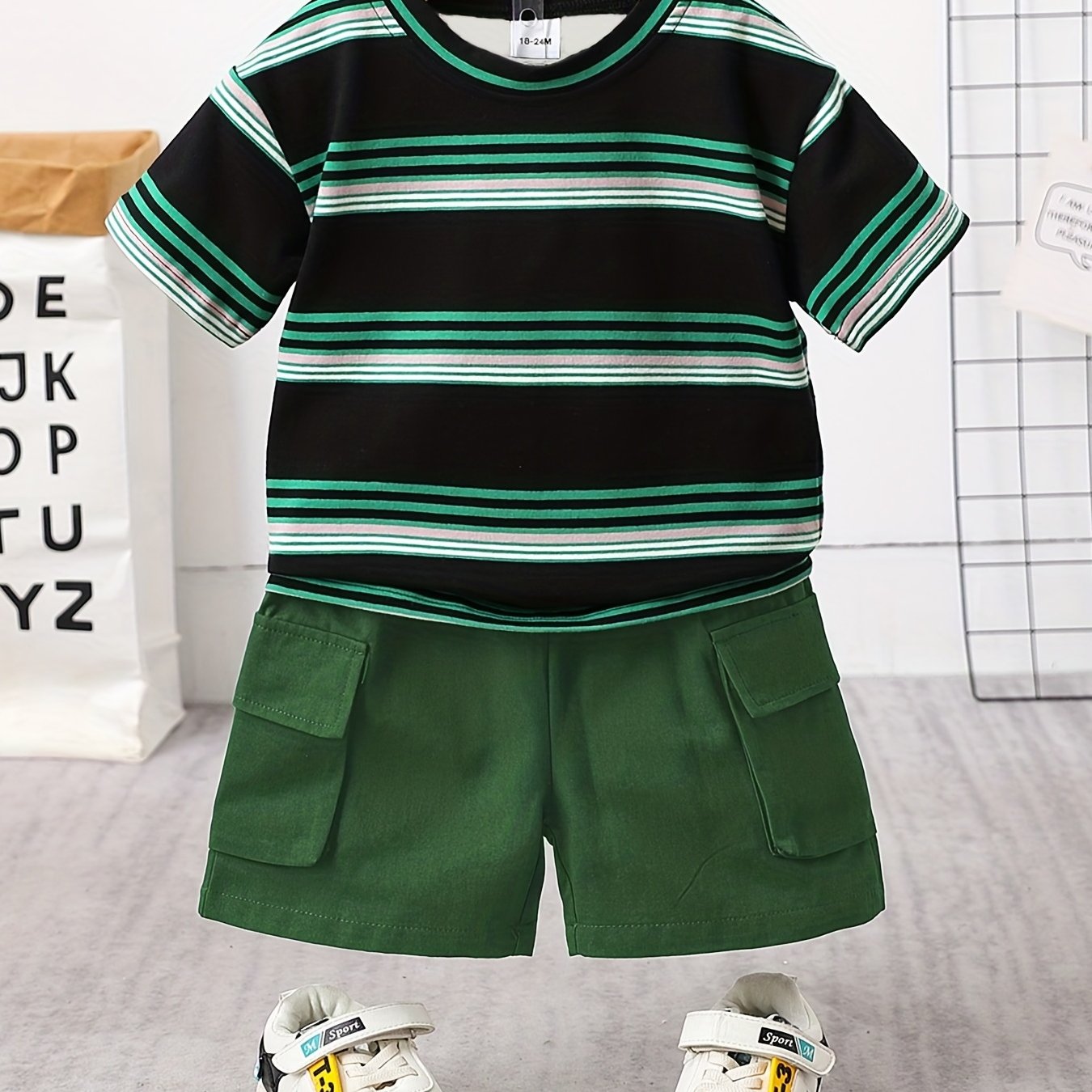 2pcs Boys' Summer Casual Outfit Set - Striped Knit T-Shirt and Cargo Shorts with Pockets, Polyester and Spandex Blend, Regular Fit, for Outdoor