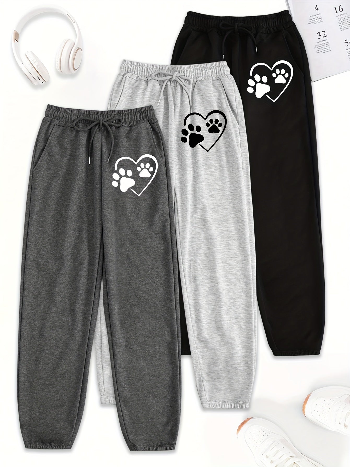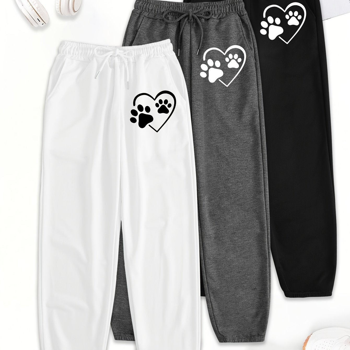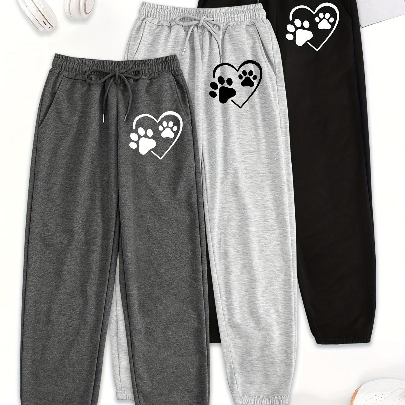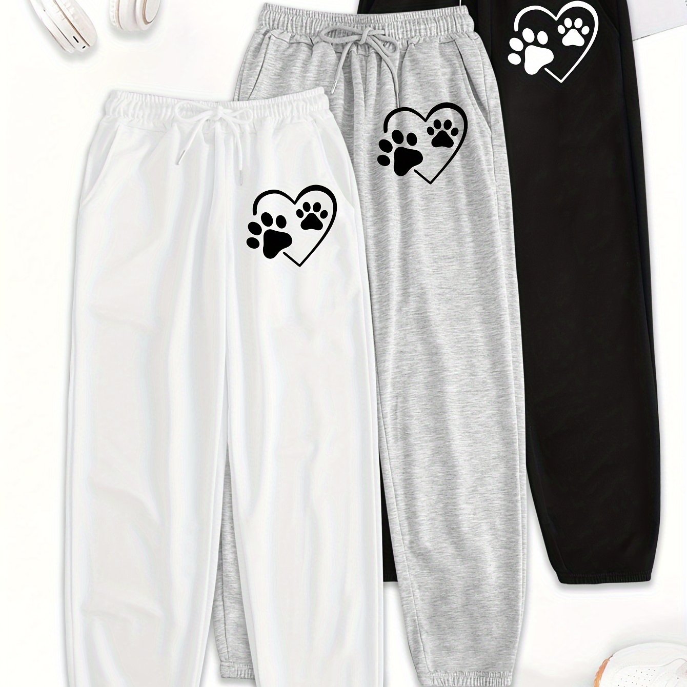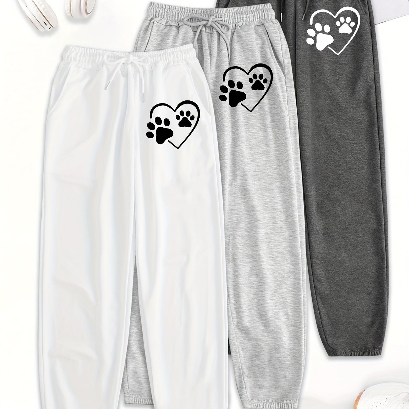 3-Pack Women's Drawstring Pants, Polyester Knit Casual Joggers with Paw Print Design, Elastic Waist, Pocket, Loose Fit, All-Season Sports Pants for Adults