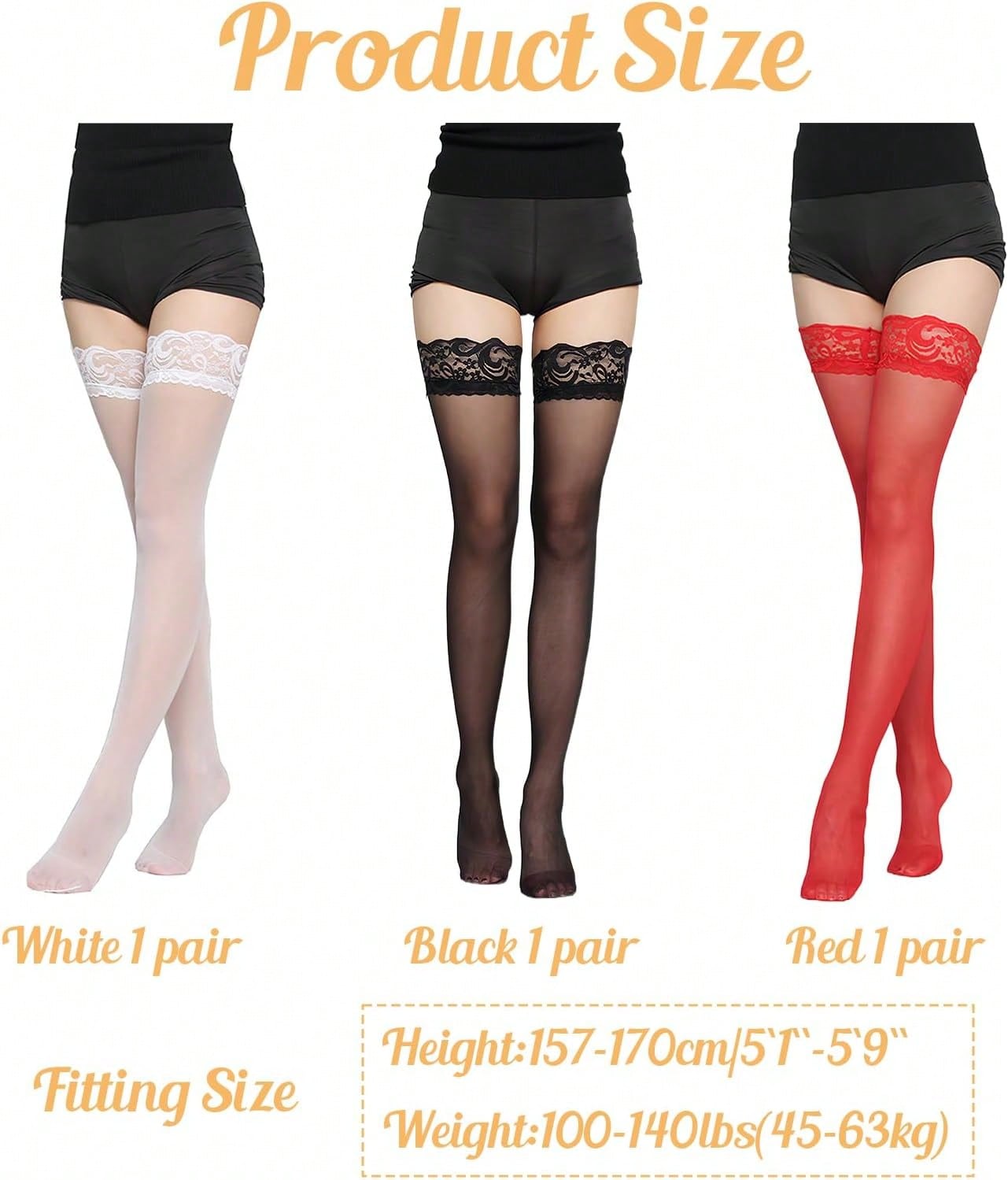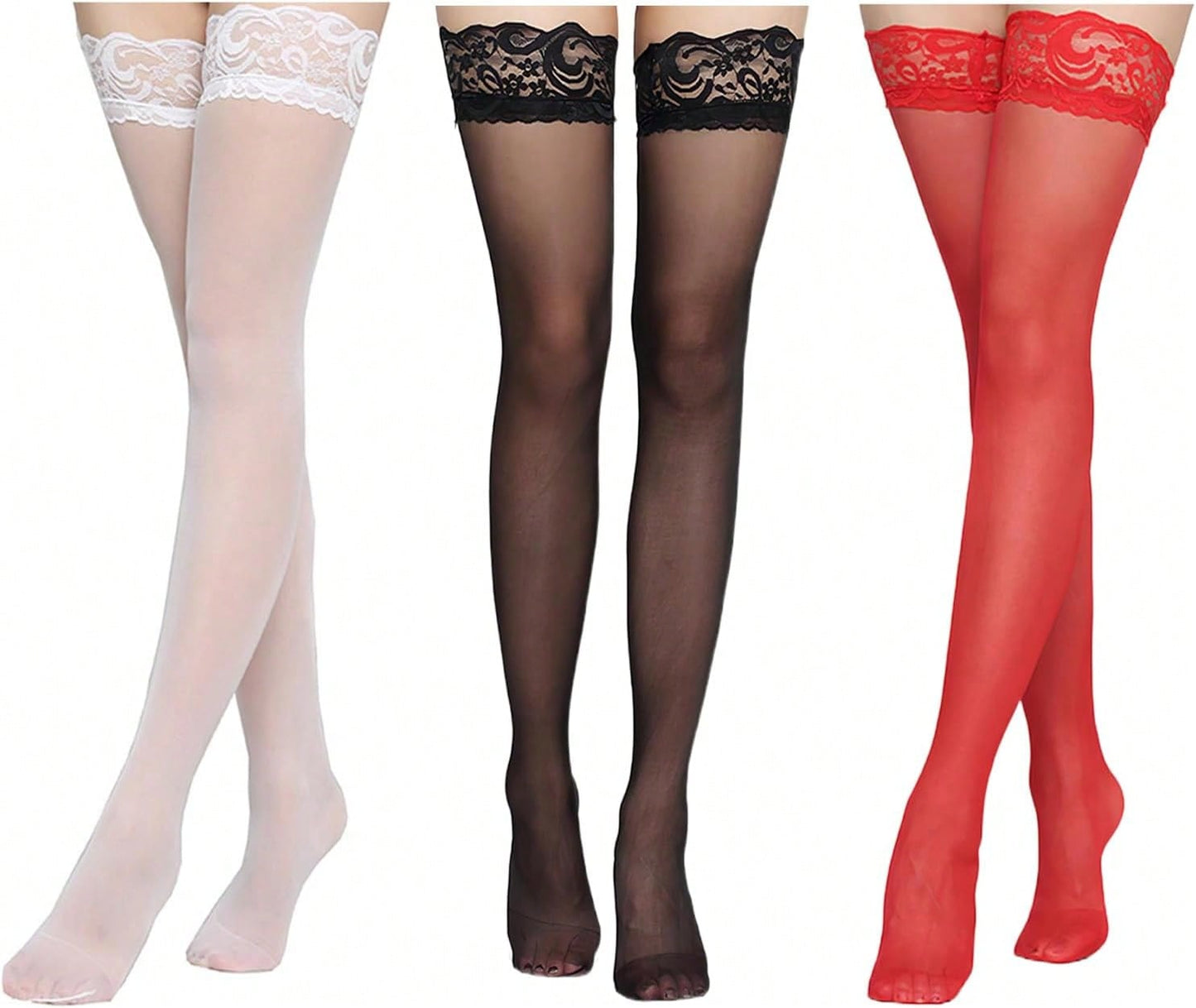 3Pairs Women's Hold-Up Stockings Black White Red Thigh Highs With Anti-Skid Narrow Lace Top Ladies Sexy Comfortable Sheer Knee High Stocking Tights Gifts For Women Girls Supplies