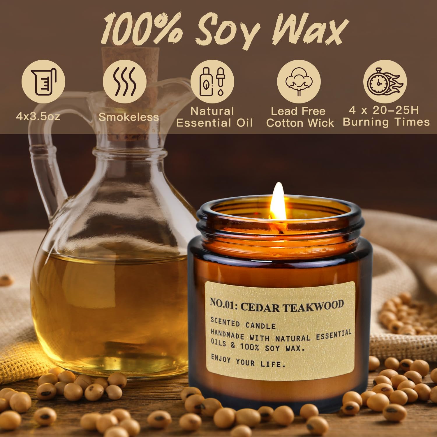 Soy Wax Candle: Blend 8% aromatic plant essential oil with soy wax. All-natural, harmless soy candles with lead-free cotton wicks. So the amber jars are recyclable. Each jar candle can burn for 25 hours, so a 4-pack of scented candles will give you up to 100 hours of scent.