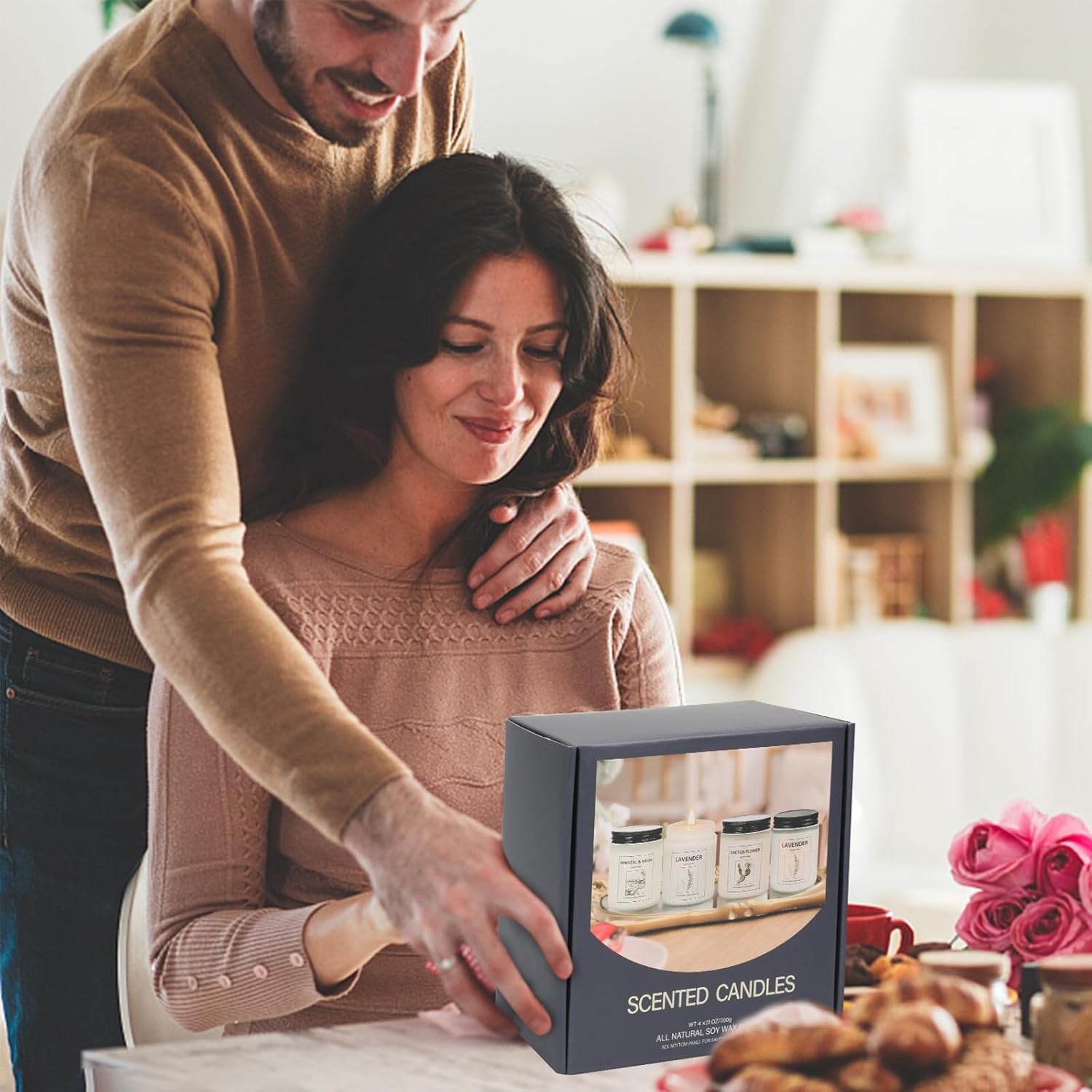 Home Candle Set Gift − Each candle weighs 0.9 pounds, 4.1*4.8 (inches), retains fragrance for 45-50 hours, burns without black smoke, upgraded wick does not break easily, and can burn soy wax completely to the bottom of the jar.