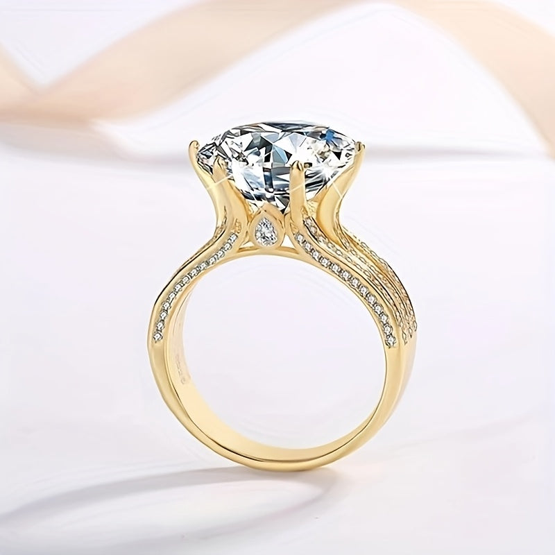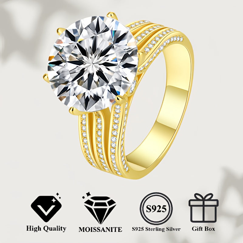 5Carat/10Carat DVS1 Moissanite Engagement Ring, S925 Silver Six-prong Slightly Inlaid Promise Ring, Women'S High-end Jewelry, April Birthstone, Golden Plated Design, Suitable for Proposal, Engagement, Wedding Special Edition, Valentine'S Day, Birthday and