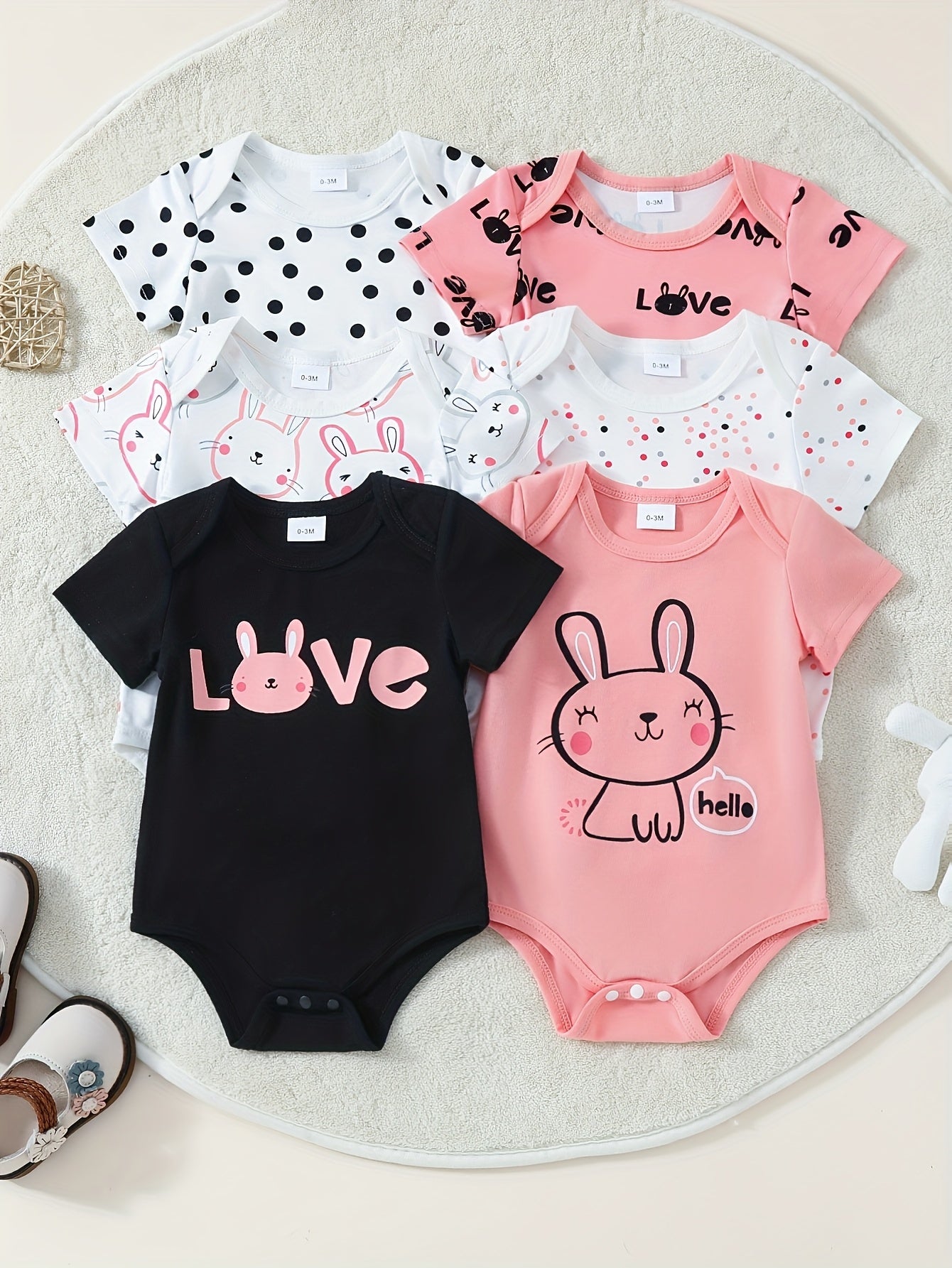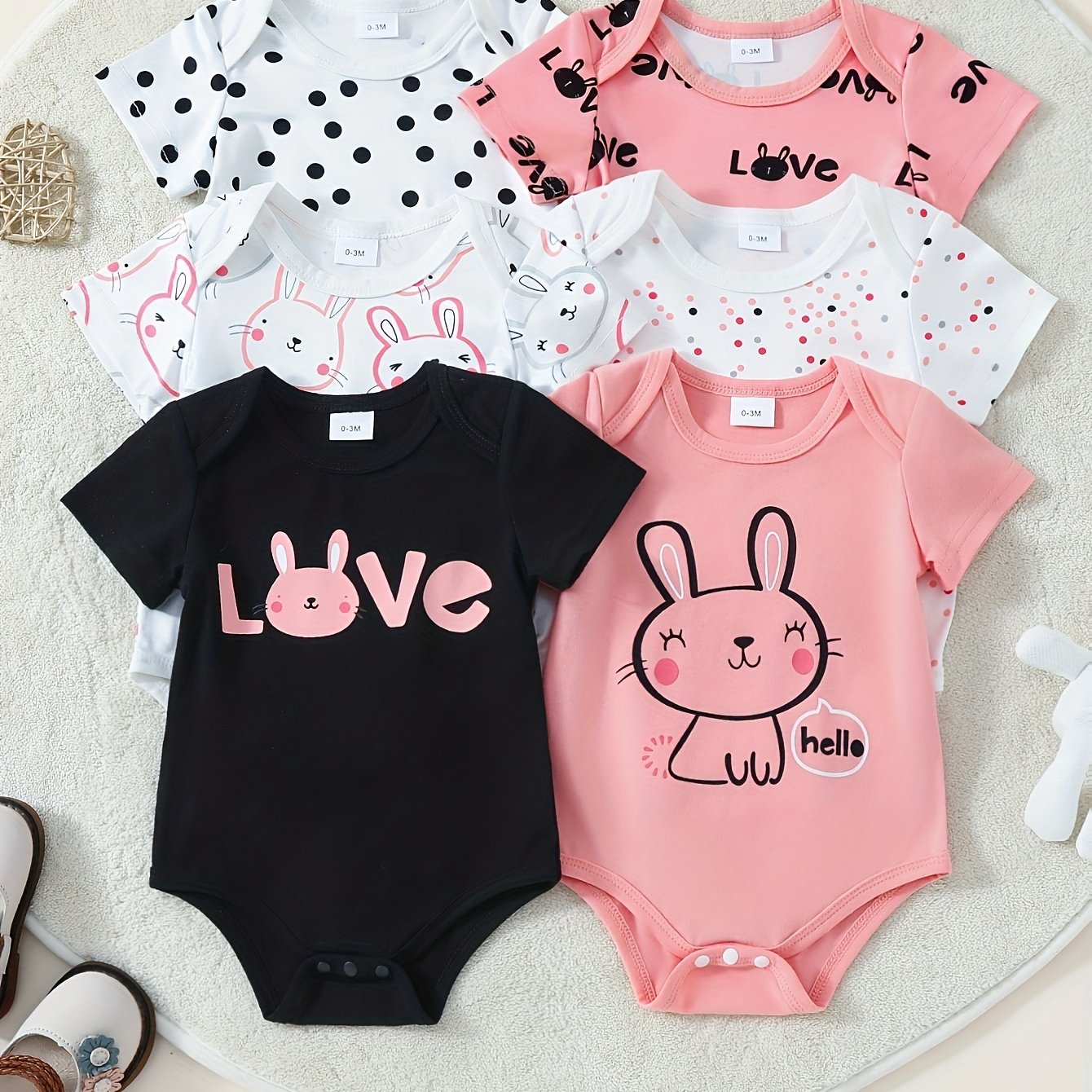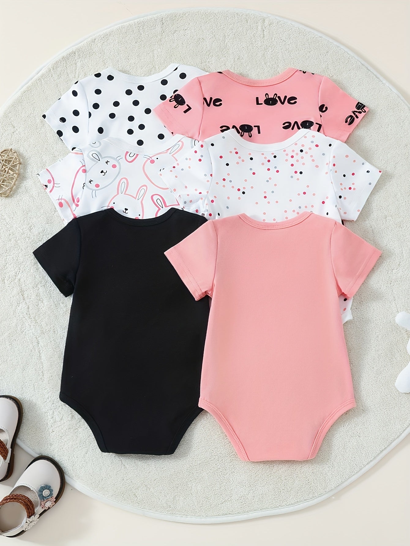 6pcs Adorable Bunny & Polka Dot Youngsters Bodysuits - Soft Polyester Short Sleeve Rompers, Machine Washable, All-Season Comfort for Youngsters (White, Pink, Black), Perfect for Outdoor
