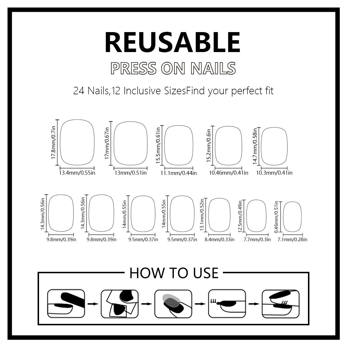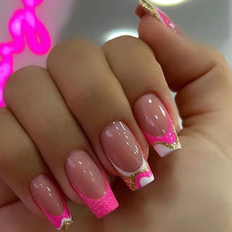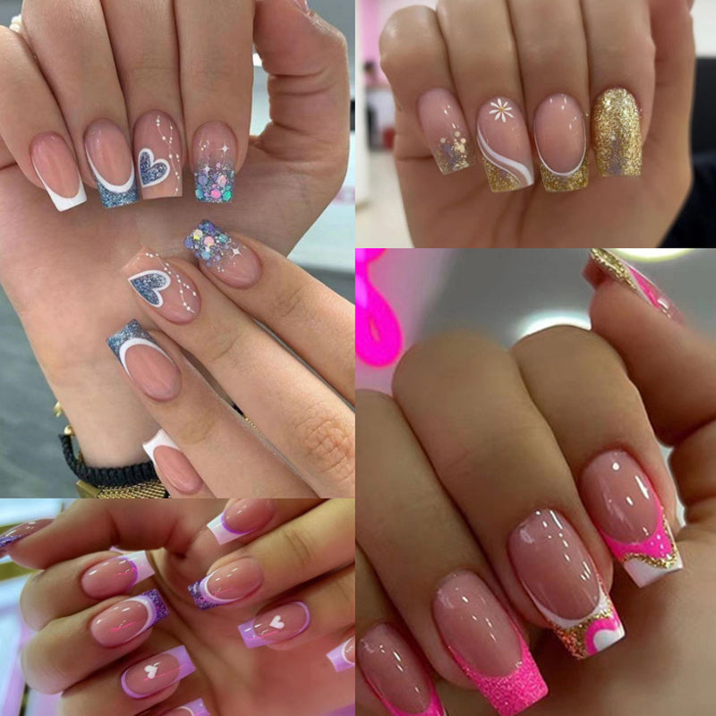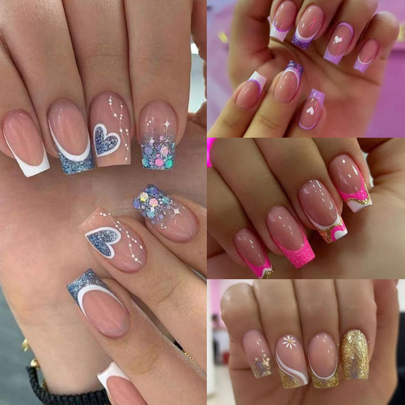 96PCS (4PACK) French tip fake nails with cute heart flower design gloss medium square emboxed nails, shiny glue nail set with adhesive label, women's nail file