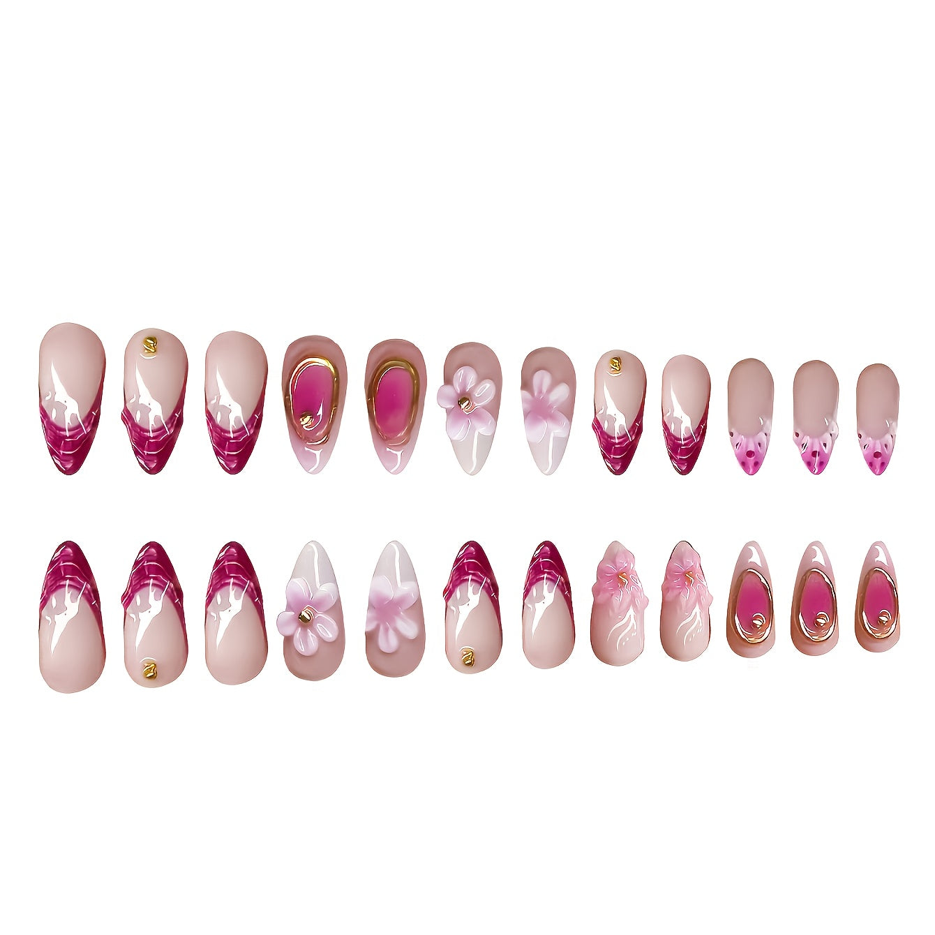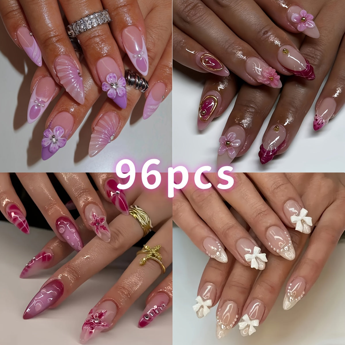 96pcs Mixed Color Almond Shaped Press On Nails Set, Middle Length, Glossy Finish, with Floral and Glitter Patterns, Includes Jelly Glue & Nail Files, for Women and Girls, Elegant Design Gift Set