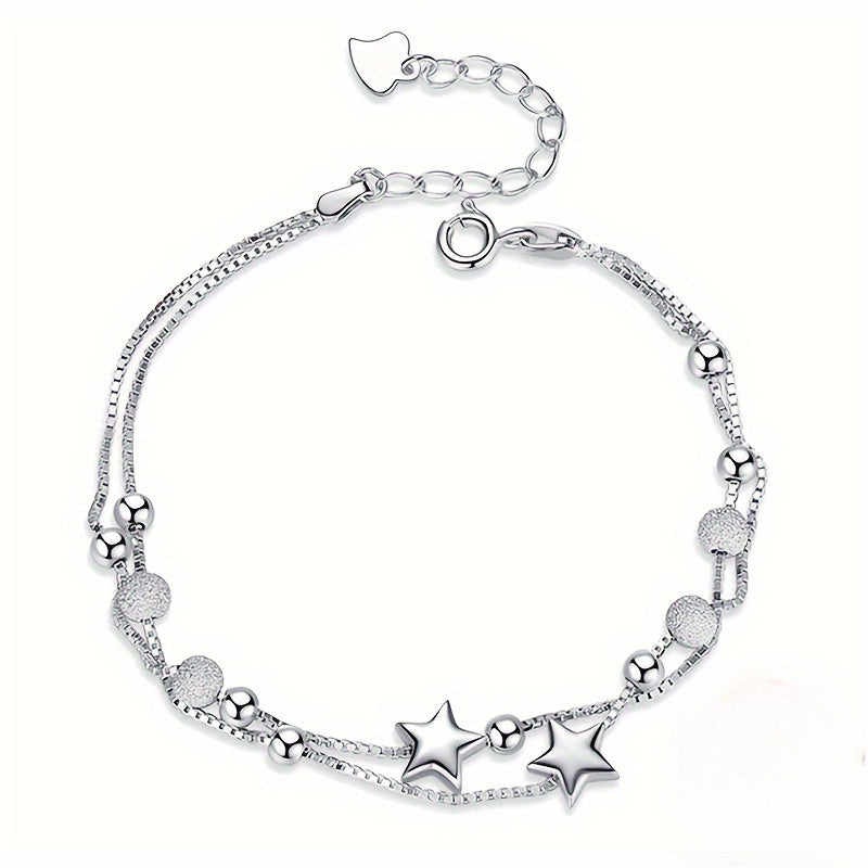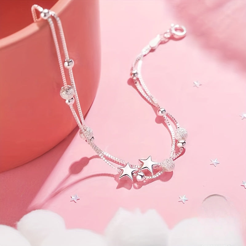 A Double-layered Silver-Plated Star Pendant Bracelet, Paired With Textured Beads, Featuring A Fashionable Style, Versatile Jewelry For All Seasons, Suitable For Daily Wear