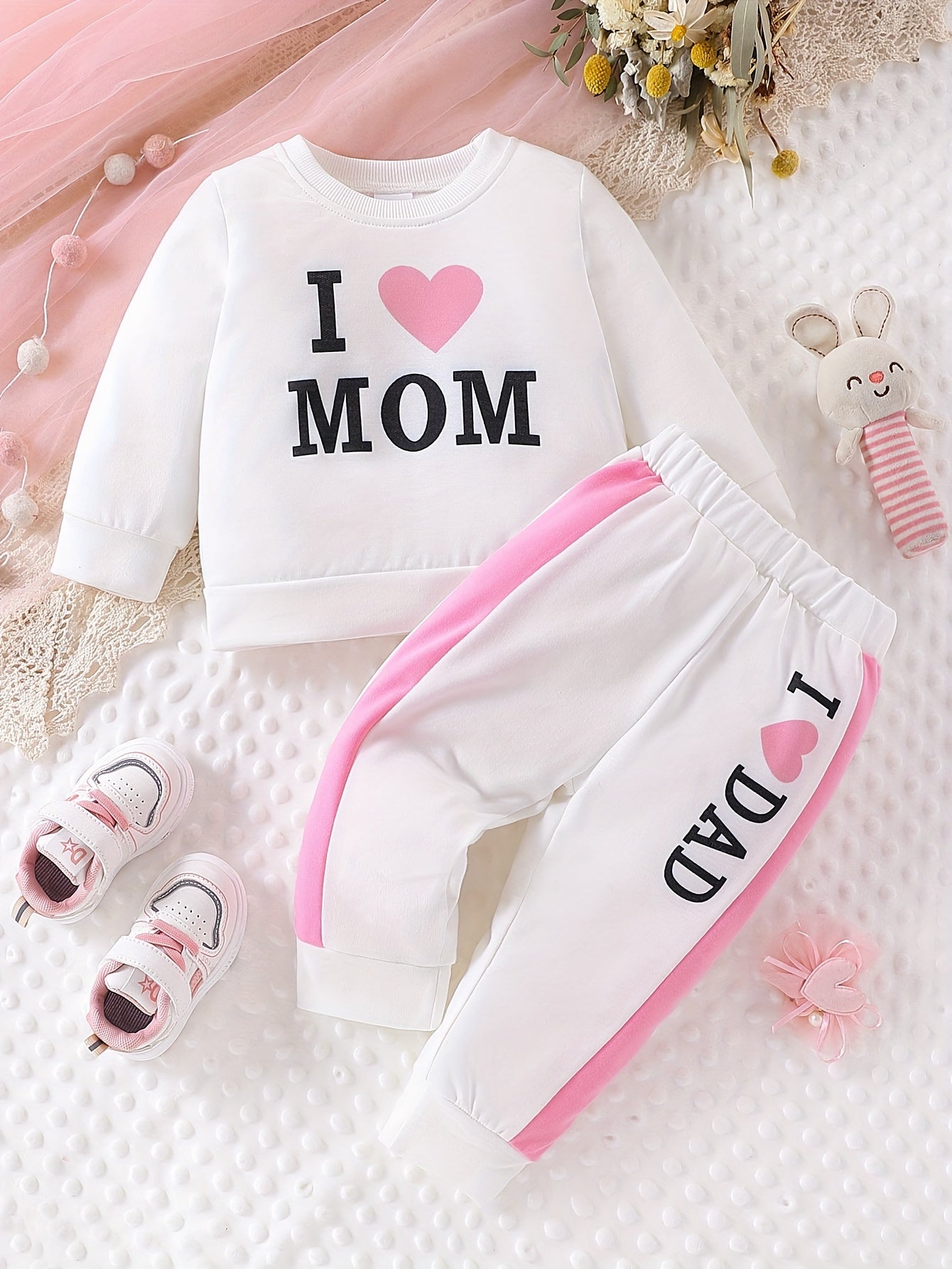 Adorable 'I Love Mom' Letter & Heart Print Knit Fabric T-Shirt and Pants Set for Baby Girls - Cozy Casual Outfit with Elastic Waistband, Perfect for Fall/Winter, Baby Girl Clothes, Perfect for Outdoor