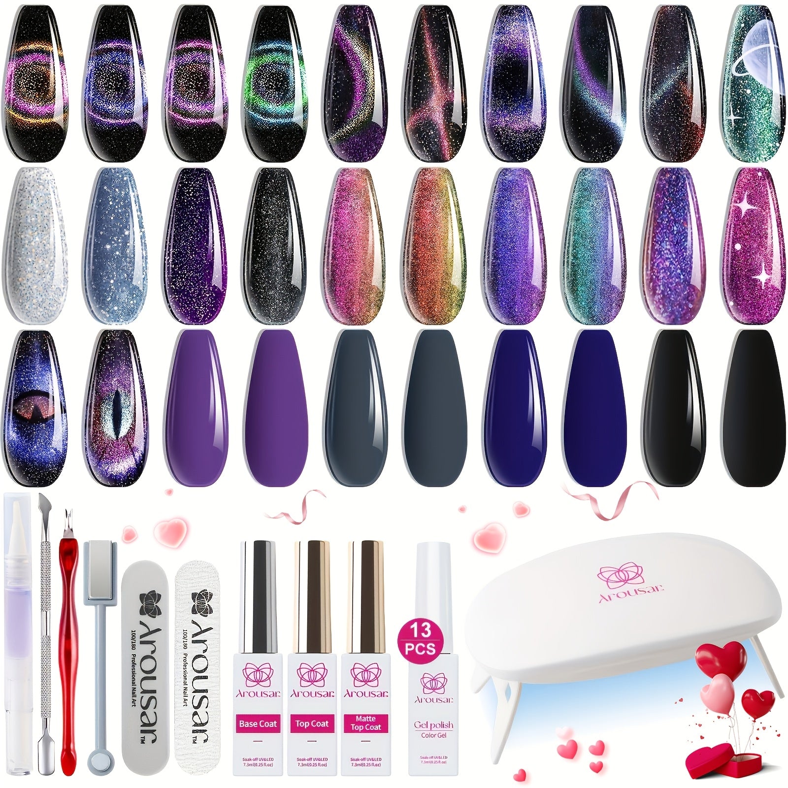 Arousar Cat Eye Gel Polish Set, 16pcs Chameleon Gel Nail Polish Black Purple Glitter Silvery Changing Magic Galaxy Effect Kit With Base Top Coat, LED Nail Lamp, Cuticle Oil And Manicure Tools Valentine'S Day Gift For Women And Girls