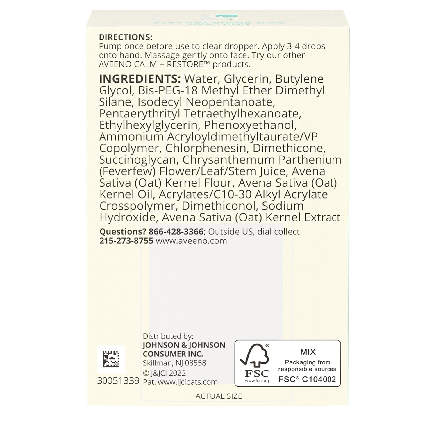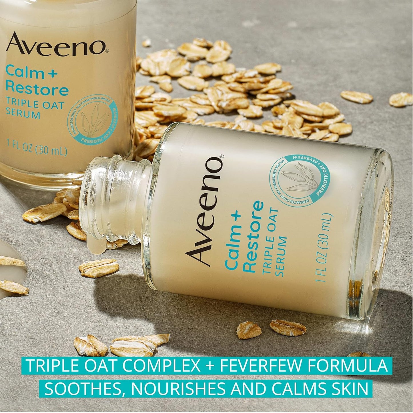 1-fluid ounce of Aveeno Calm + Restore Triple Oat Hydrating Face Serum with calming feverfew for sensitive skin to instantly smooth & fortify skin's moisture barrier to leave skin feeling soft & supple