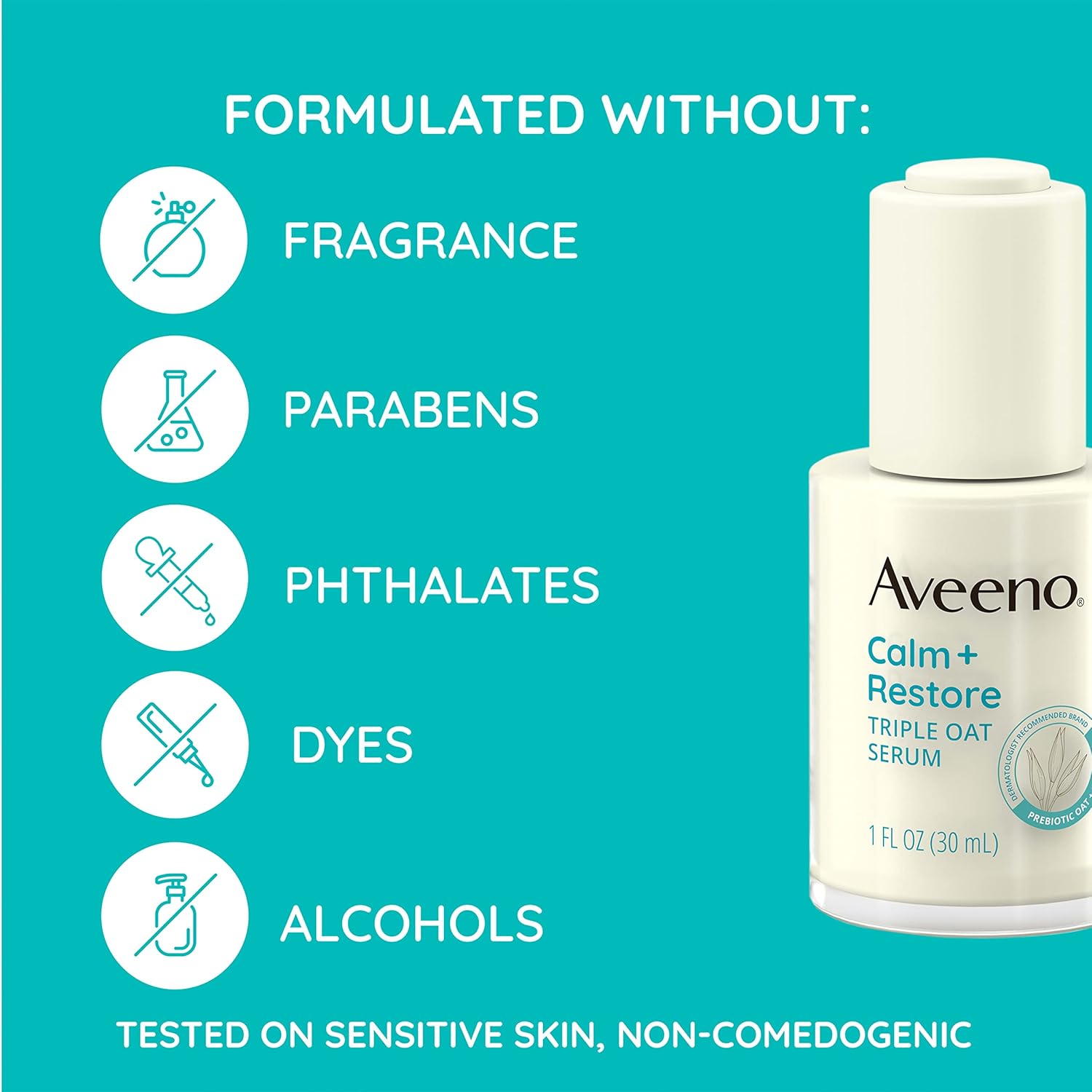 Aveeno Calm + Restore Triple Oat Hydrating Face Serum for Sensitive Skin, Gentle, Lightweight Facial Serum Instantly Smooths Skin, Fast-Absorbing, Hypoallergenic & Fragrance-Free, 1 fl. oz