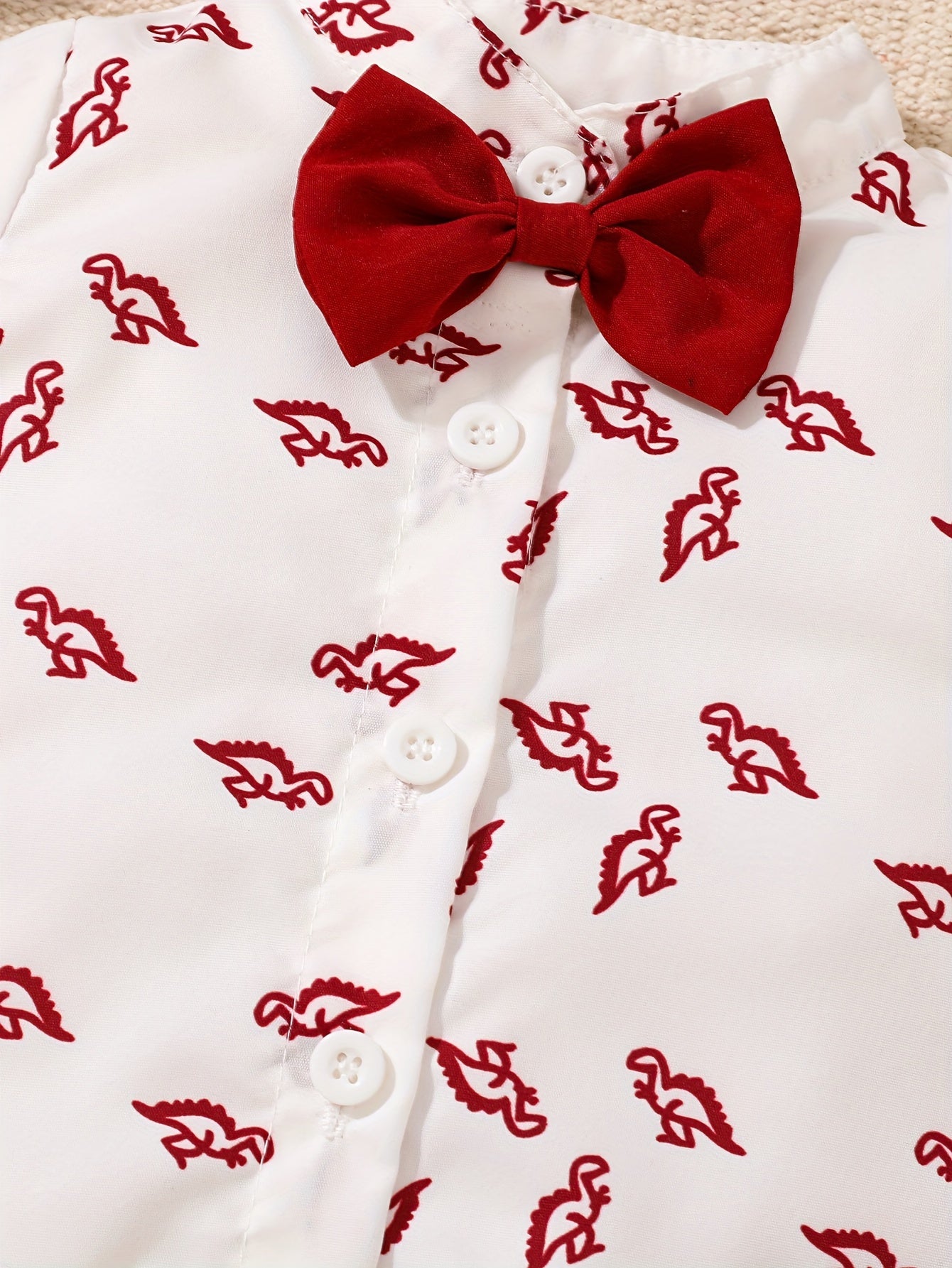 Baby Boys Cute Dino Allover Print Short Sleeve Shirt With Bow Tie & Solid Suspender Shorts Set, 2Pcs Infants Newborns Stylish Outfit, Outdoor Cloth
