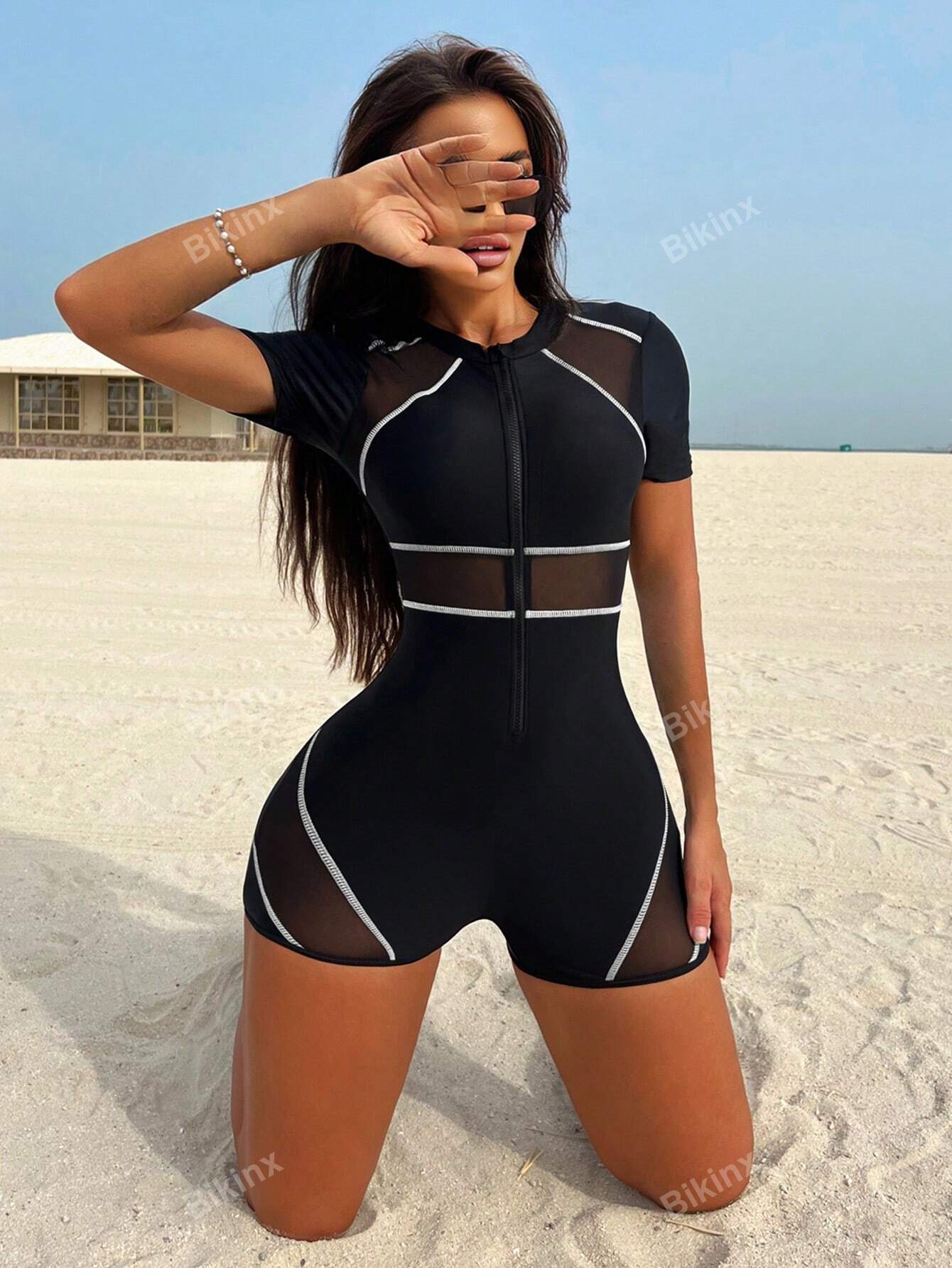 Bikinx Color Blocked Mesh Short Sleeve Surfing Wetsuit With Lock-Stitch Seams One-Piece Swimsuit Summer