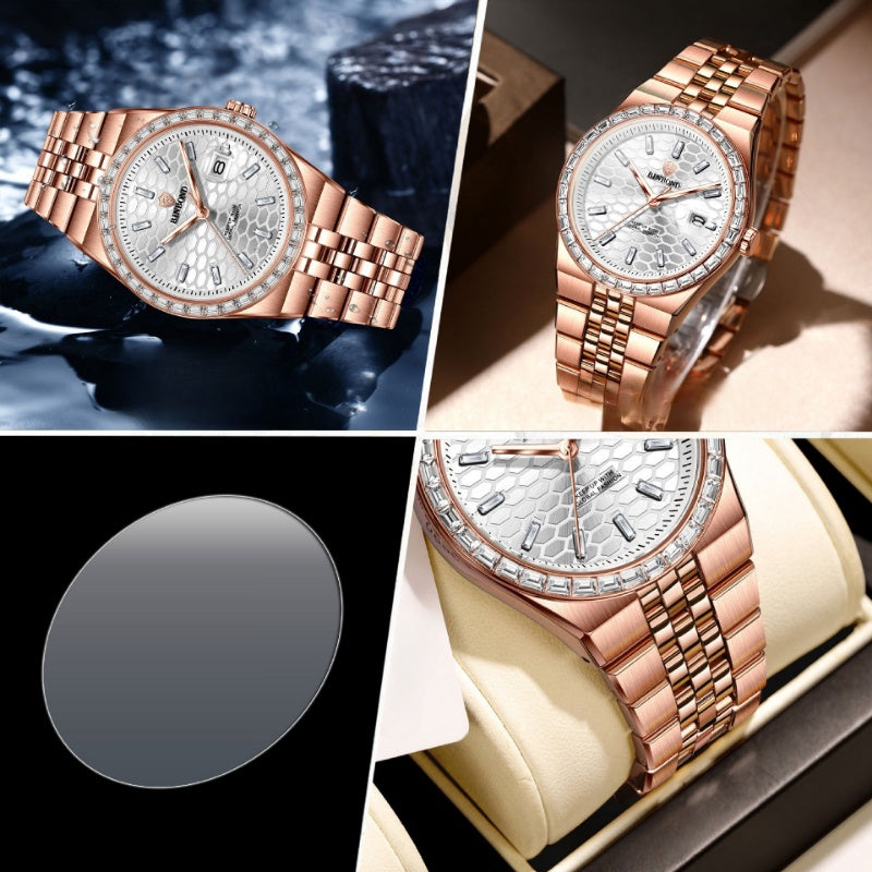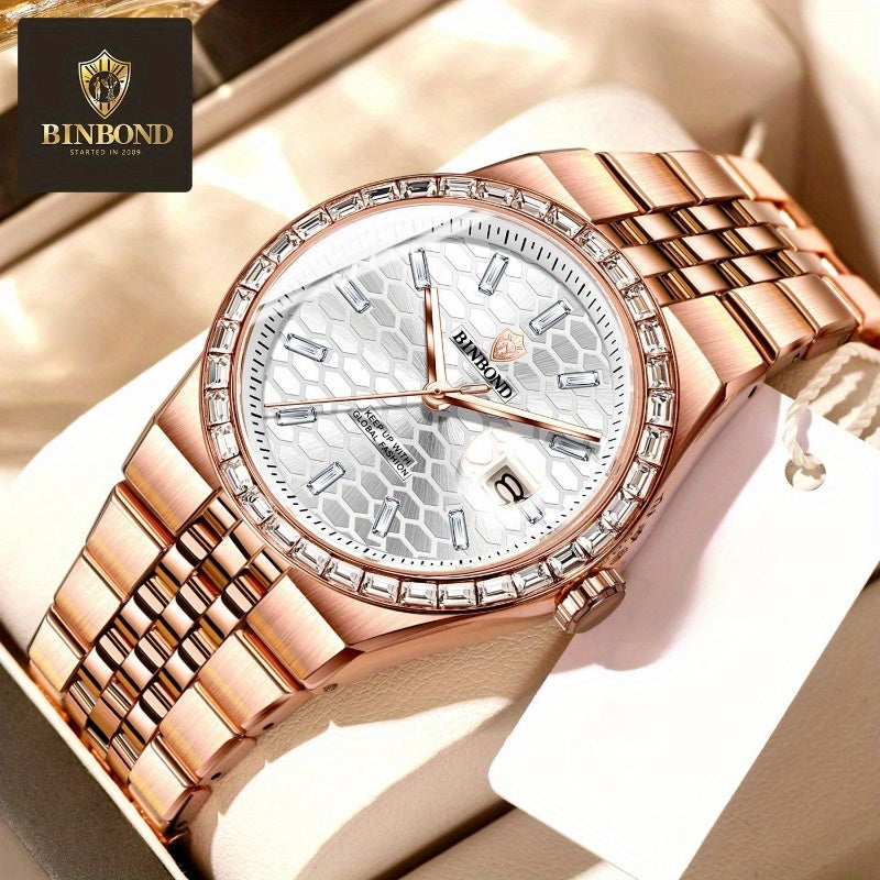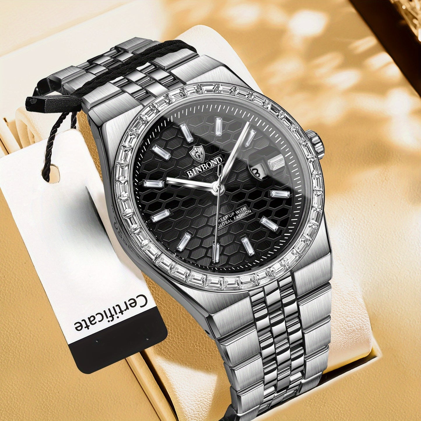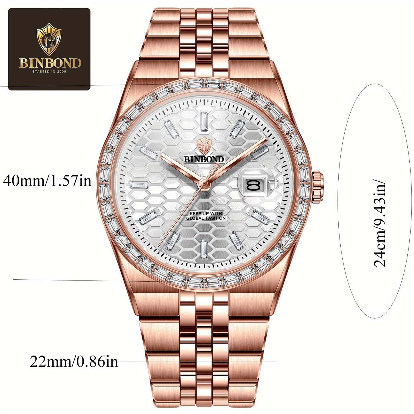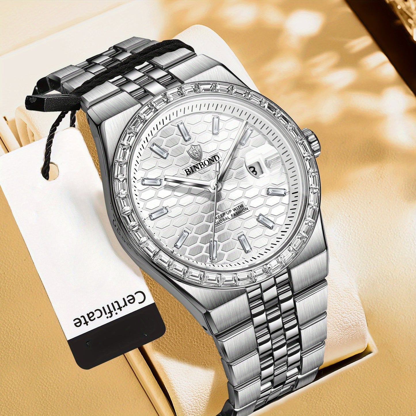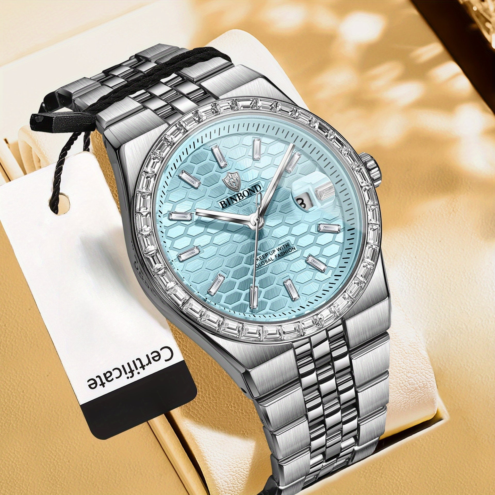 BINBOND Men's Mechanical Watch with Date & Day Display, Rhinestone-Accented Dial, Automatic Winding, Silvery-Tone Steel Band & Blue Dial - Large Circular Business Casual Sports Watch for Holidays, Birthdays, Father's Day Gifts, Formal Occasion, Casual Att