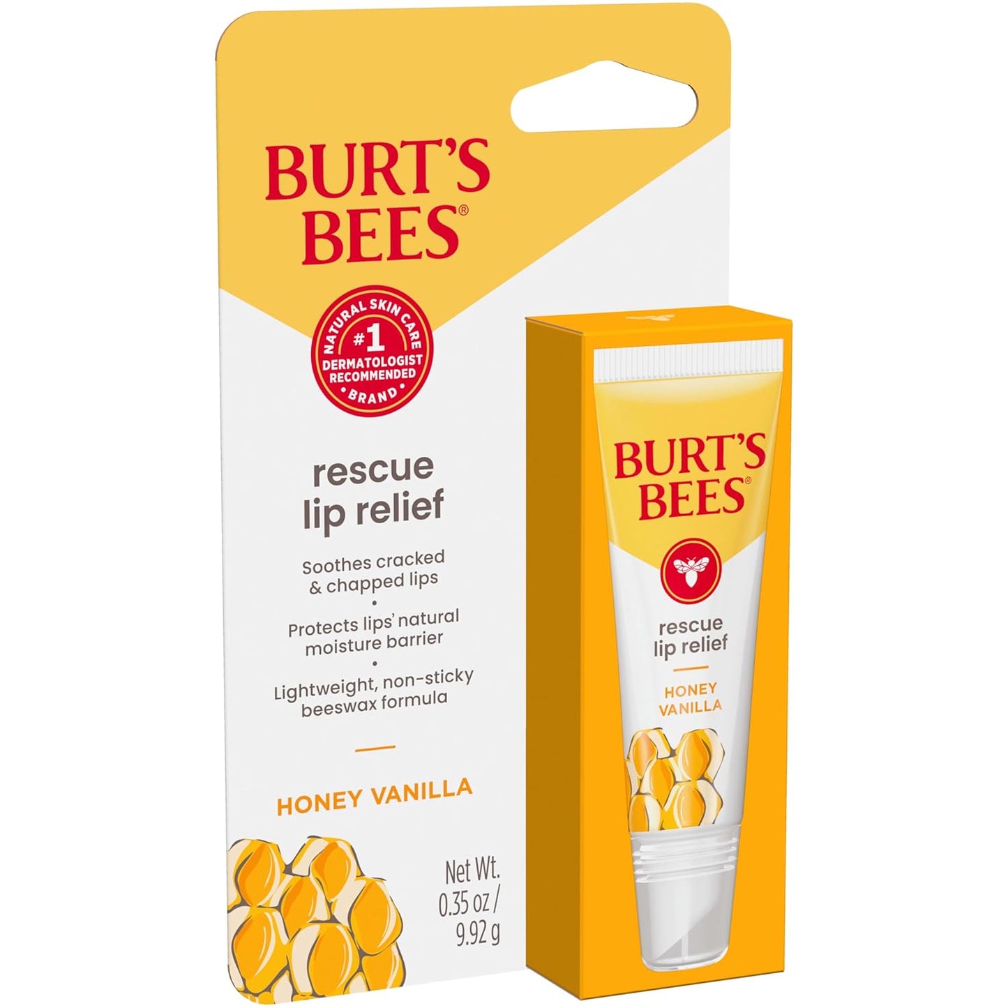 RESCUE LIP RELIEF: One 0.35 oz. tube of Burt's Bees Honey Vanilla Rescue Lip Relief Lip Balm with beeswax, shea and cocoa butter to hydrate and replenish extremely dry lips