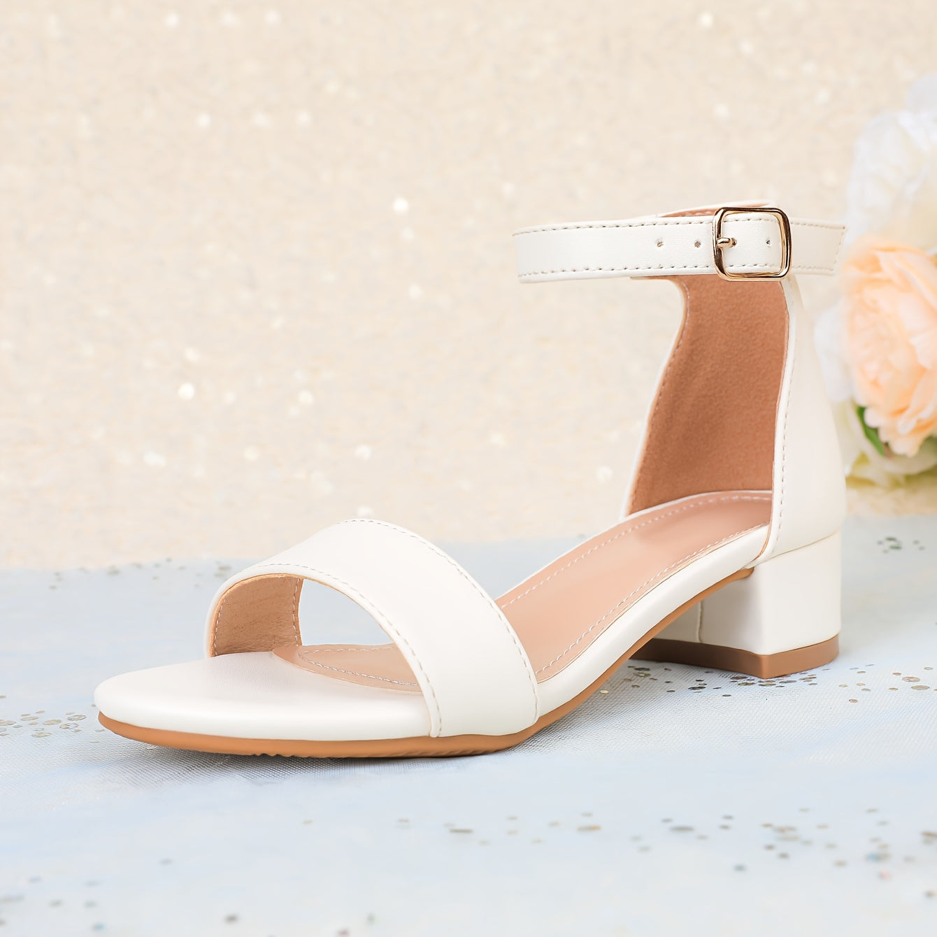 Chic Girls' Summer Footwear - Moderate Heel, Open-Toe with Ankle Strap in White & Beige - Durable Material for Casual, Party, Wedding - Comfortable Design