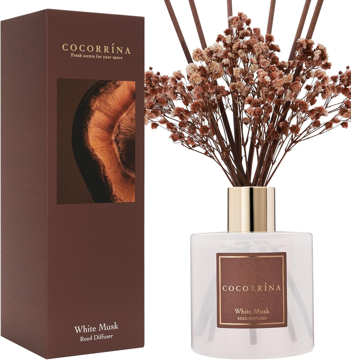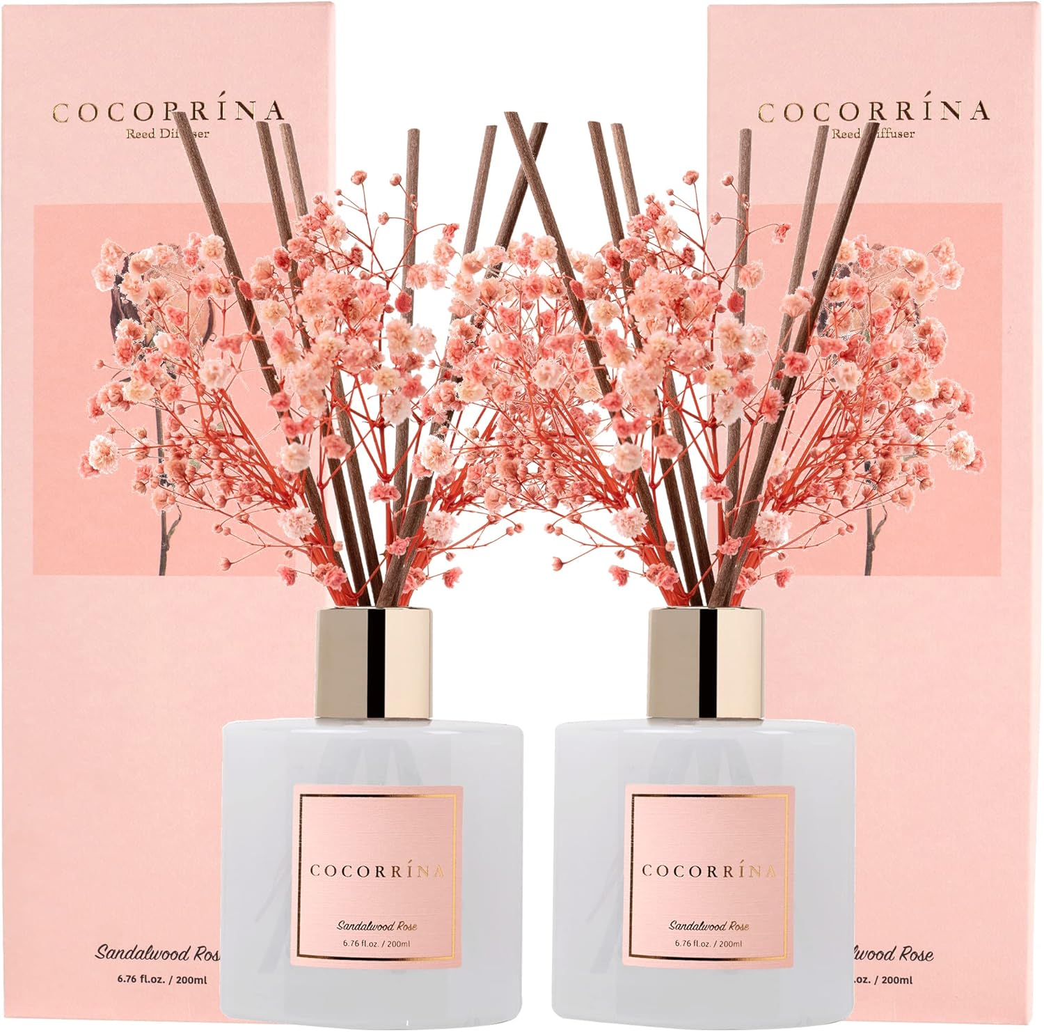 Includes: One fragrance diffuser glass bottle, 6.7 fl oz mixture of essential oils combined with fragrance, one pc. of real preserved baby's breath flowers, and 8 pure cotton sticks. Adjust the amount of aroma released by adding or removing the sticks.