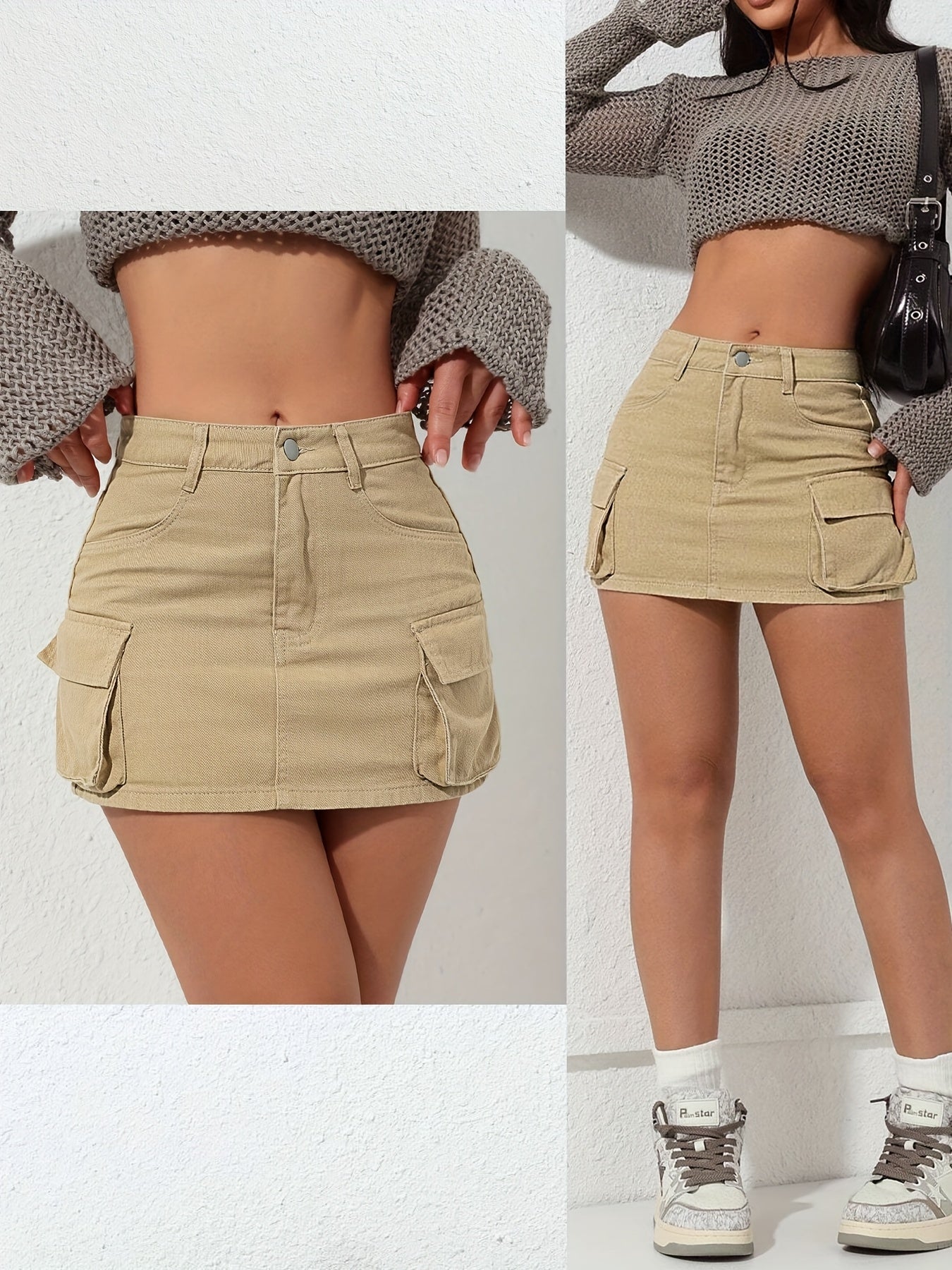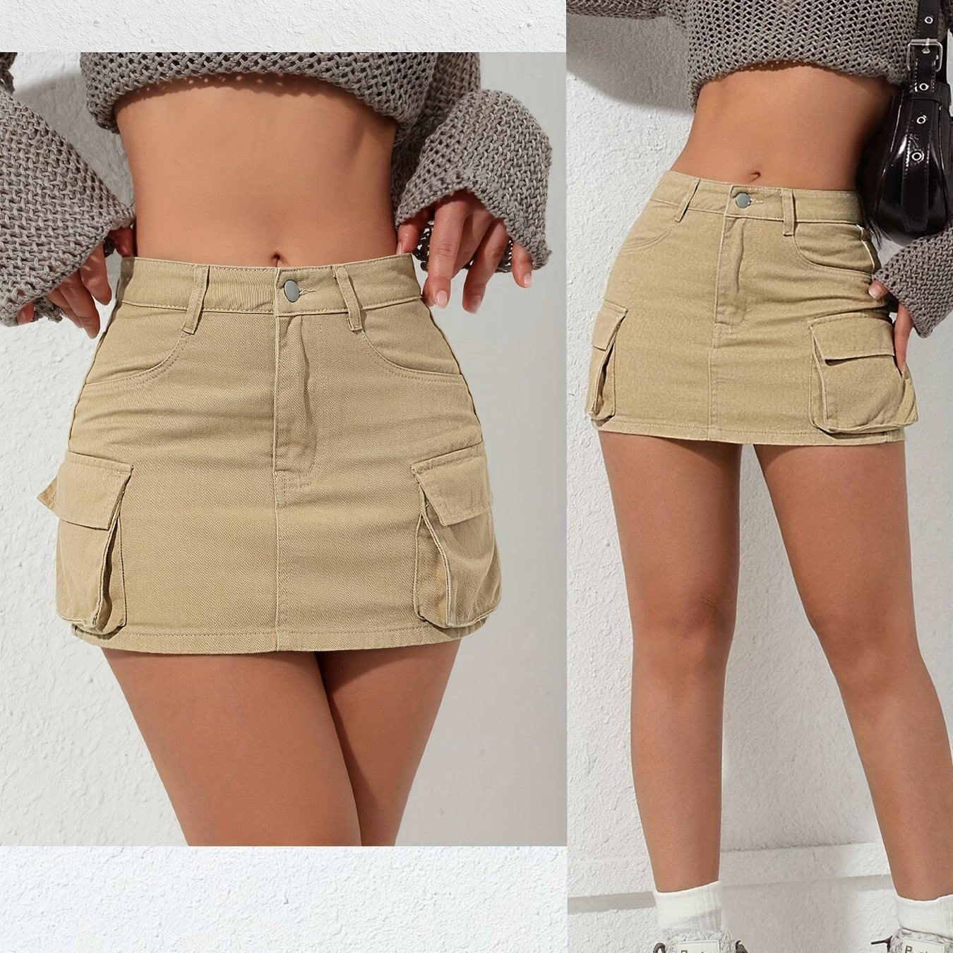 [Comfortable Cargo Denim Skirt] Stretchy & Comfortable Khaki Cargo Denim Mini Skirt - Women's Casual Style with Flap Pockets, Easy-Care for All Seasons, Fashionable Jean Skirt