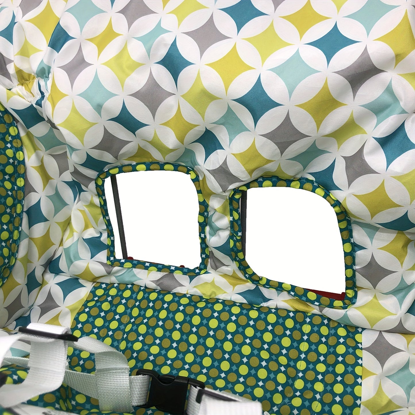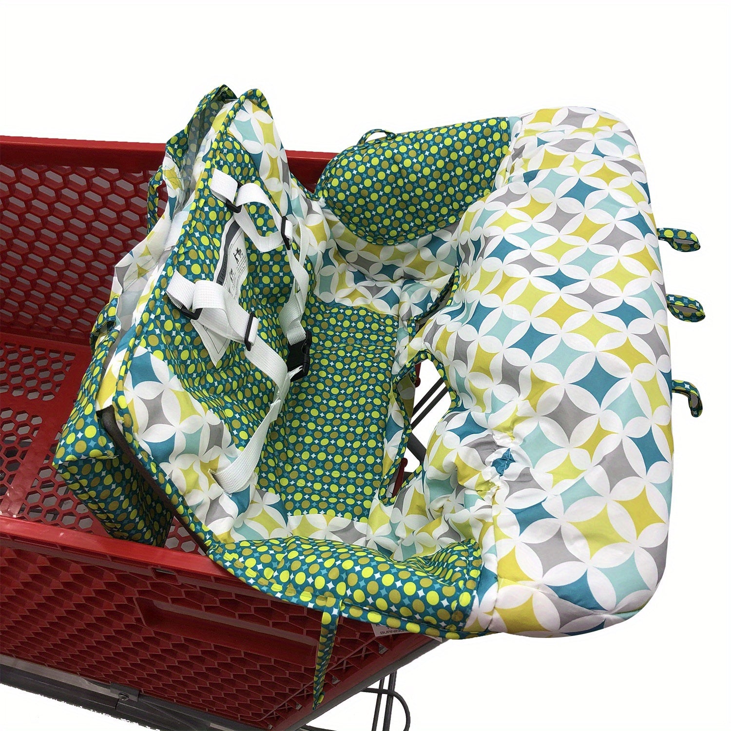 Comfy Green & Yellow Geometric Patterned Shopping Cart Seat Cushion - Durable Polyester, Machine Washable High Chair Pad with Safety Harness Attachment for Secure & Stylish Supermarket Visits