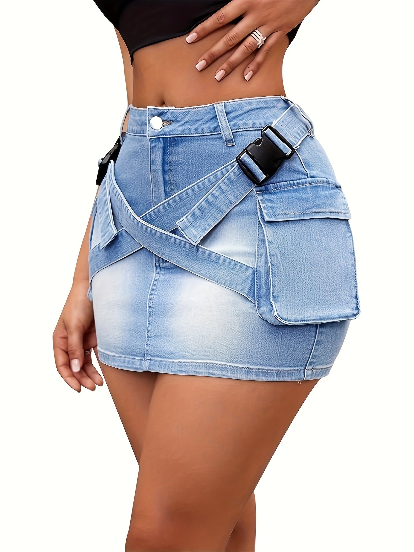 [Double Buckle Denim Skirt] Double Buckle High-Waisted Mini Denim Skirt - Flap Pocket, Elastic - Perfect for Spring/Summer/Fall Outdoor