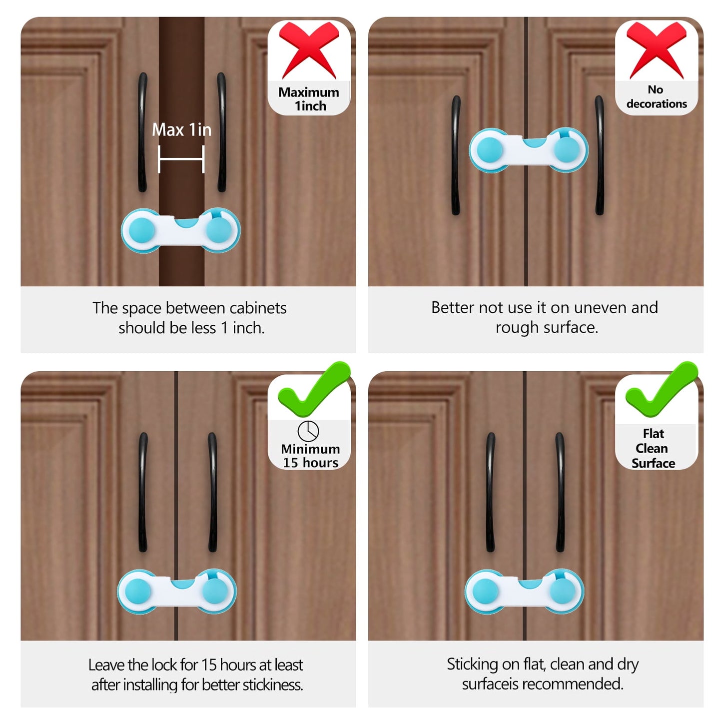 Instructions: 1. Don't touch the sticker of the Adjustable Child Safety Locks by hand during installation or reuse it that weak the adhesive;\n2. Allow 12 hours for the adhesive to dry before usage.