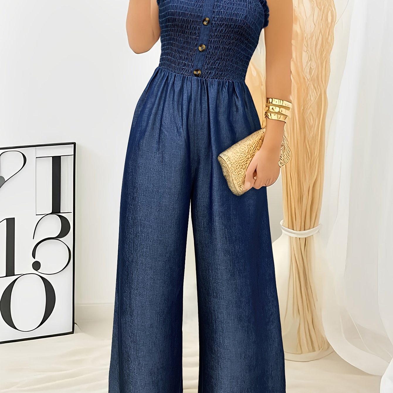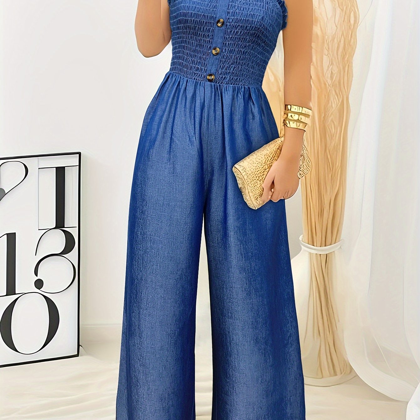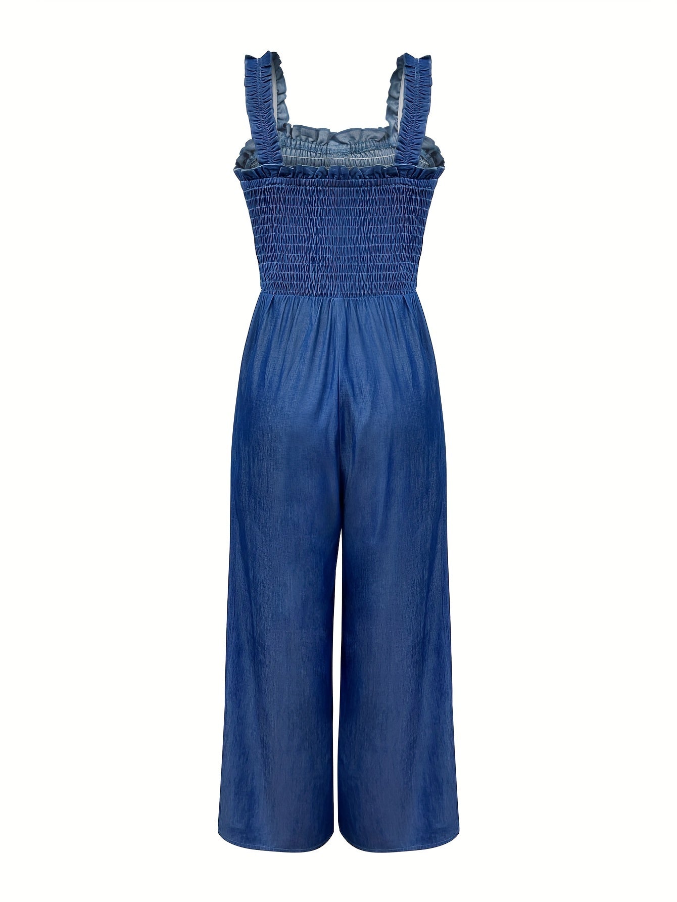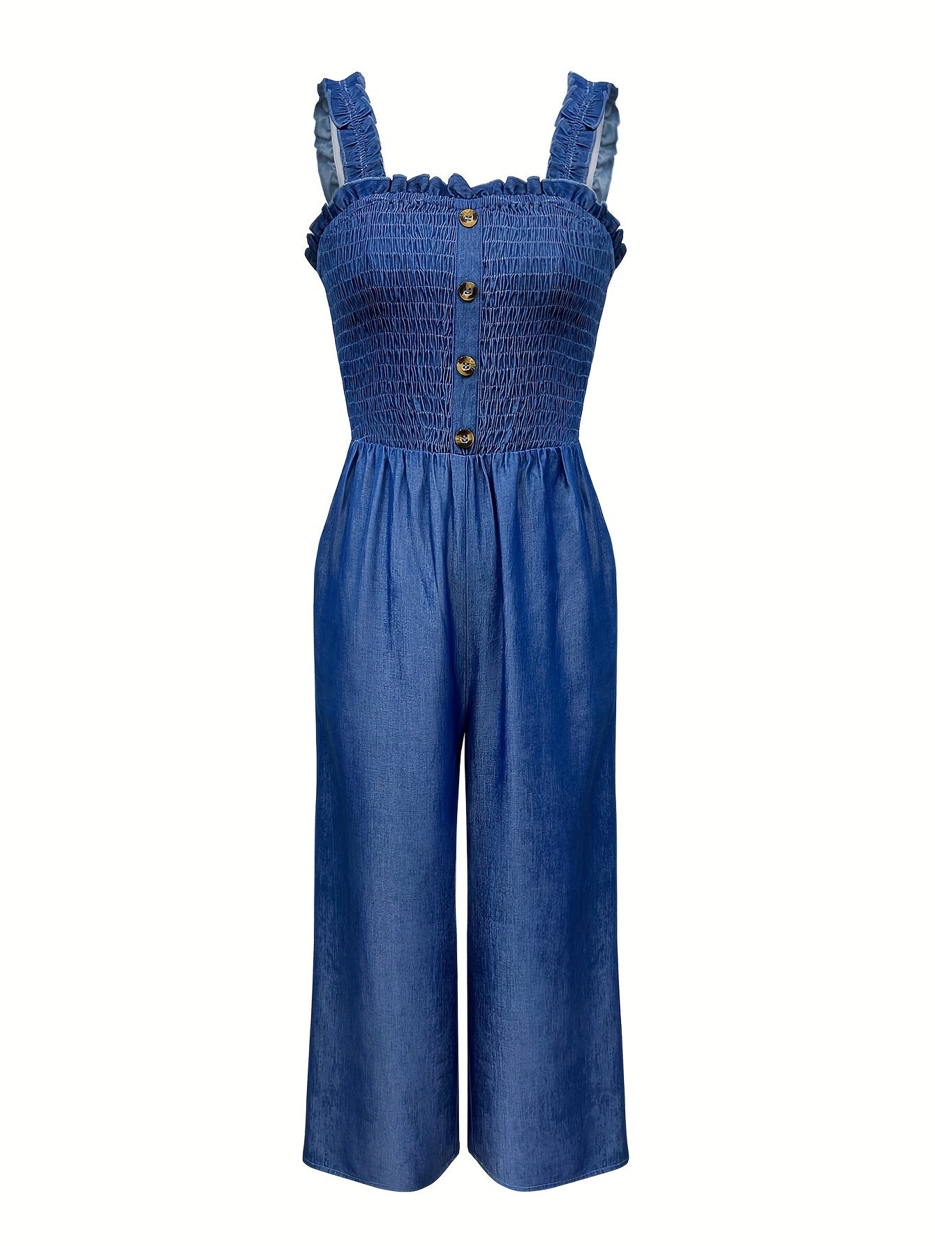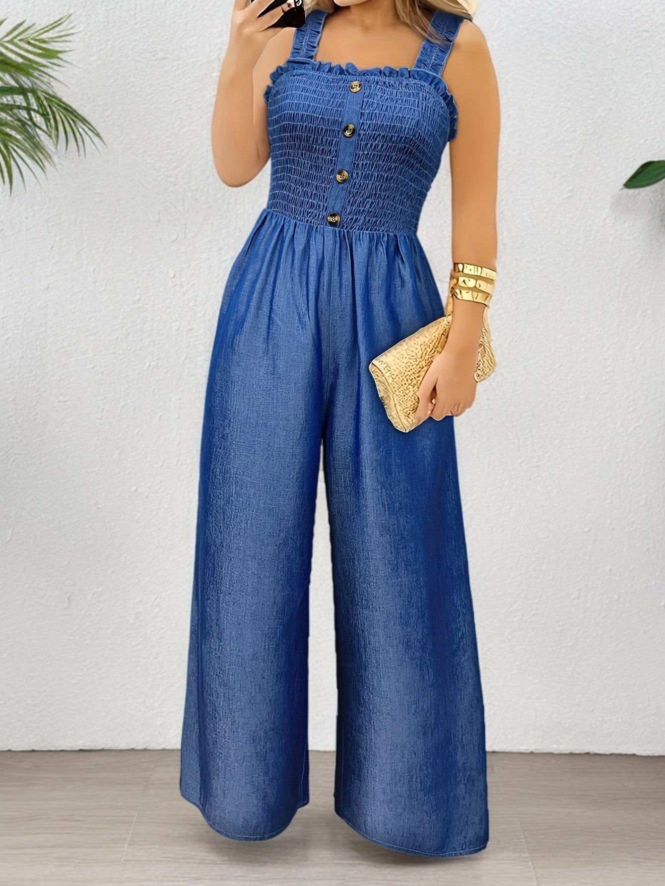 Elegant Frill Trim Slingback Jumpsuit for Women, Polyester Solid Color Wide Leg Overalls, Sleeveless with Smocked Bodice and Faux Button Detail, for Spring/Summer/Fall