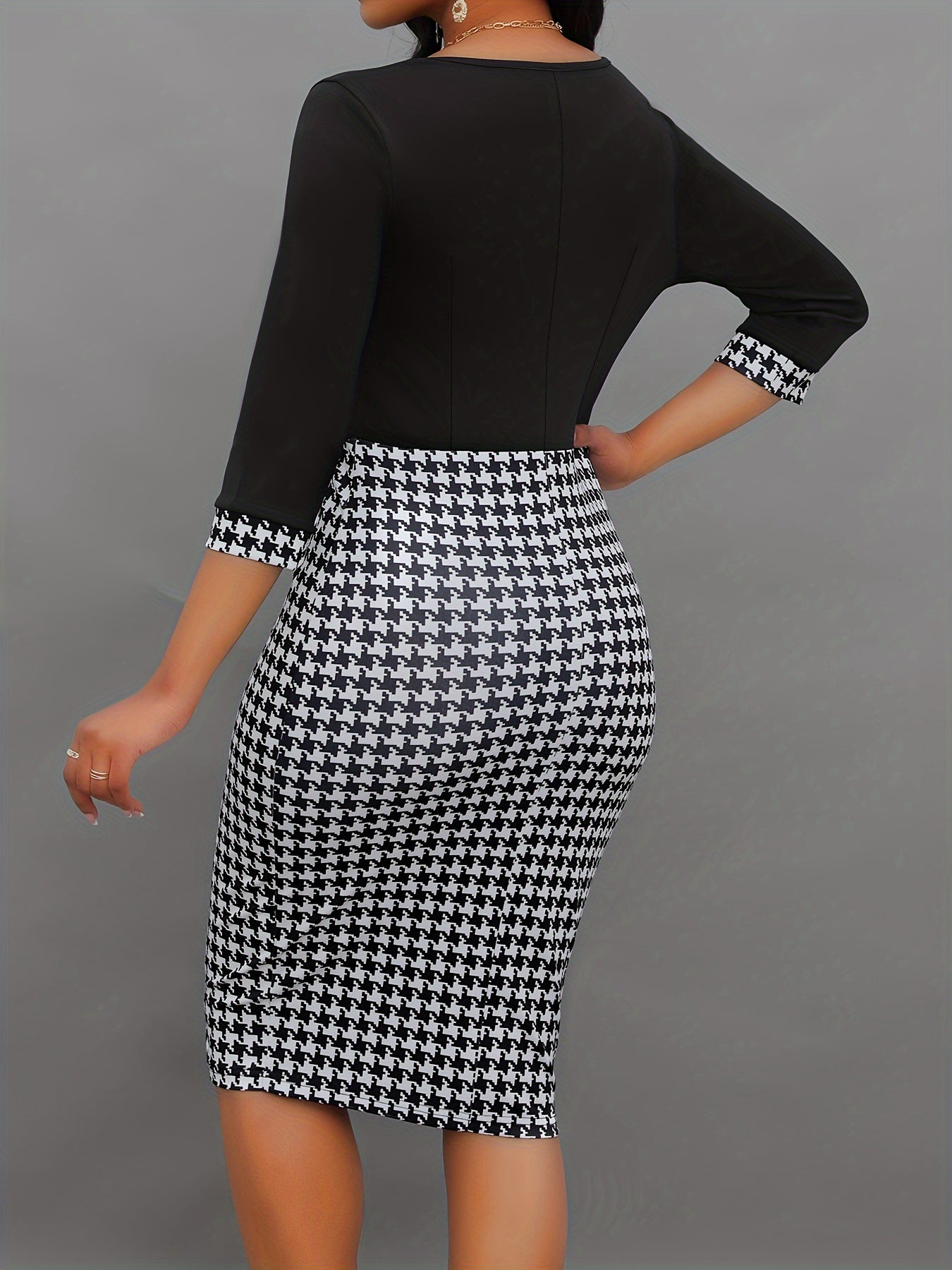 Elegant Half Sleeve Houndstooth Pattern Button Decor Bodycon Dress for Office & Work, Women's Clothing
