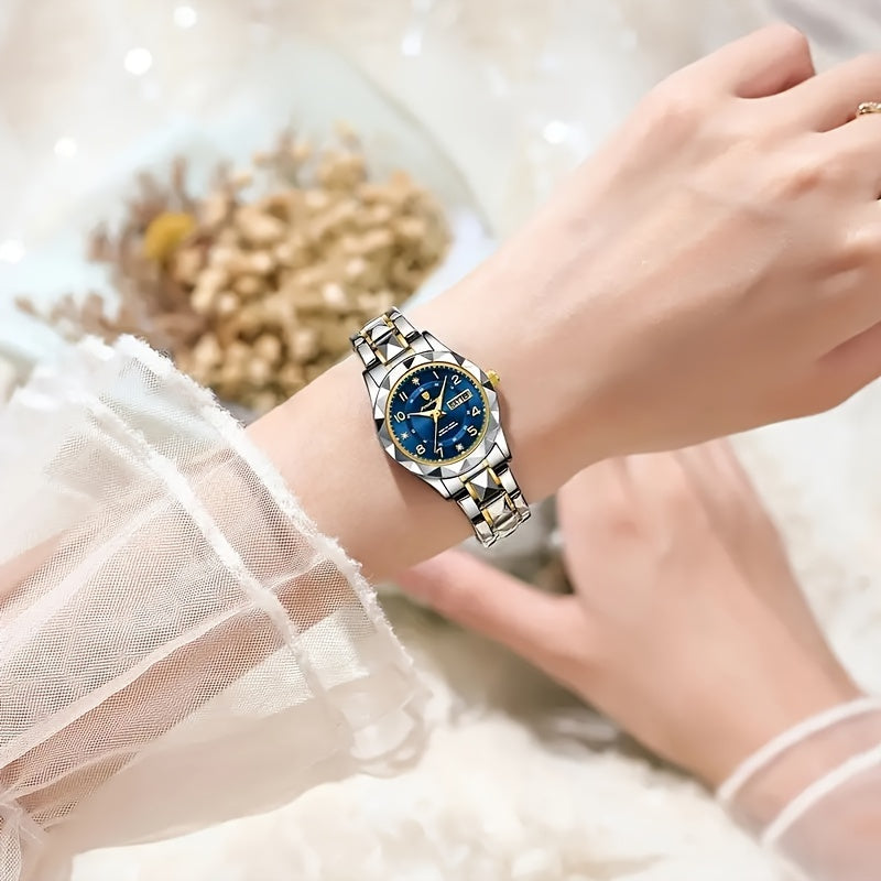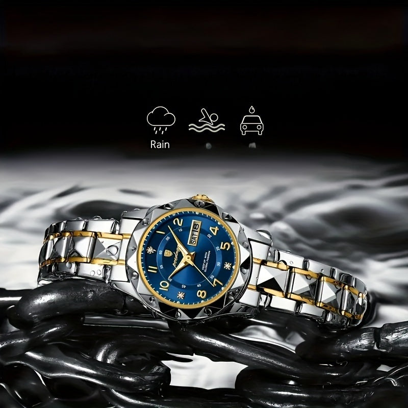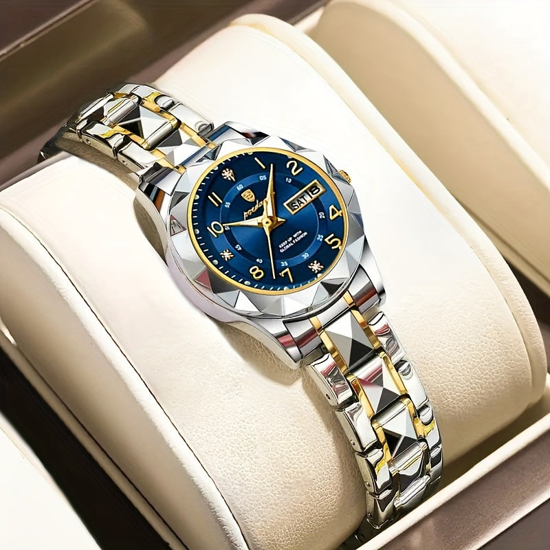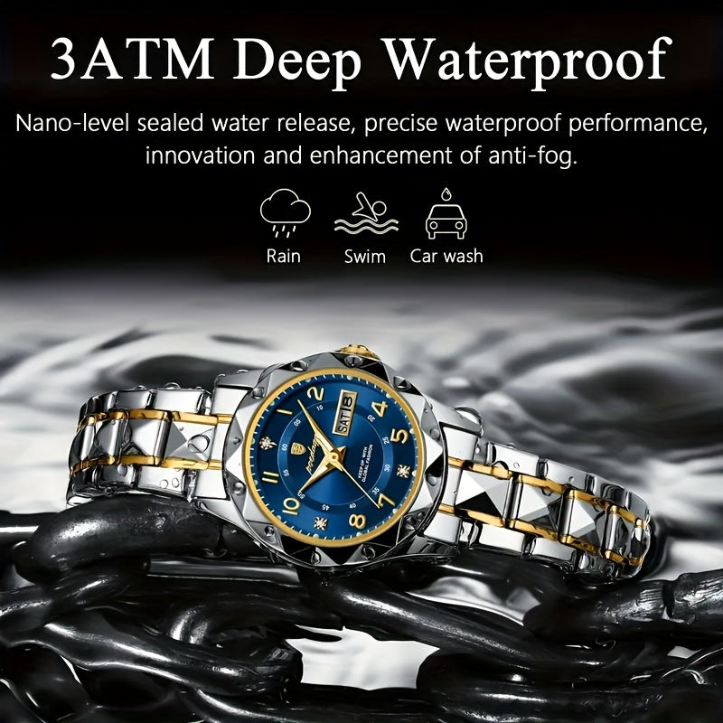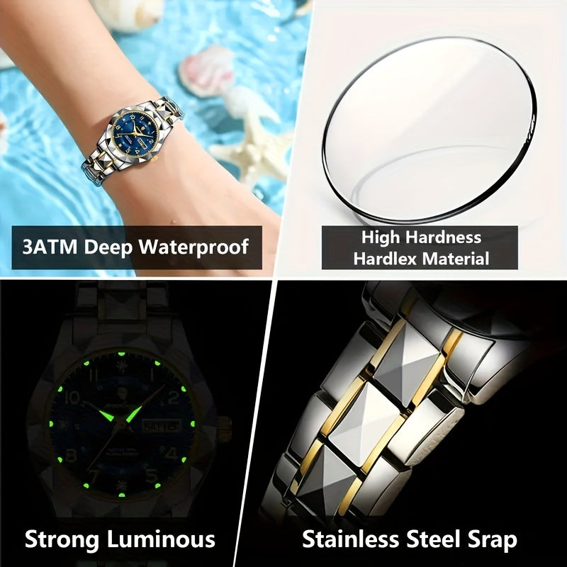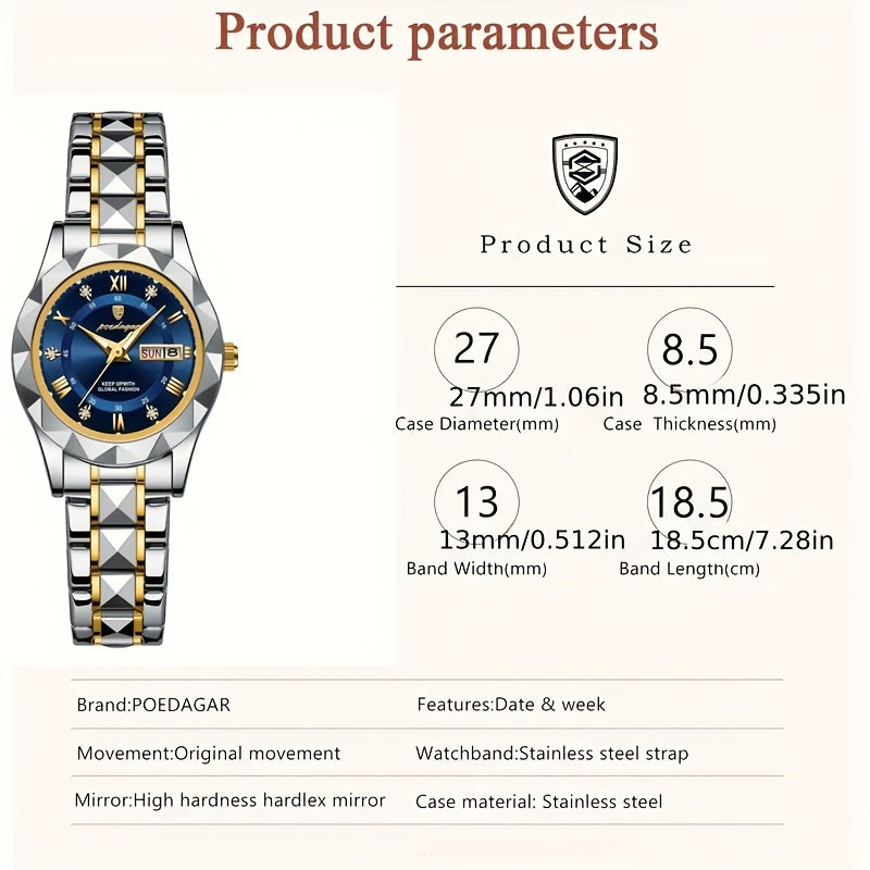 [Elegant Luxury Watch] Luxury POEDAGAR Women's Elegant Watch - Stainless Steel Band, 3ATM Water-Resistant, Luminous Hands, Calendar Feature, Digital Display, Alloy Case