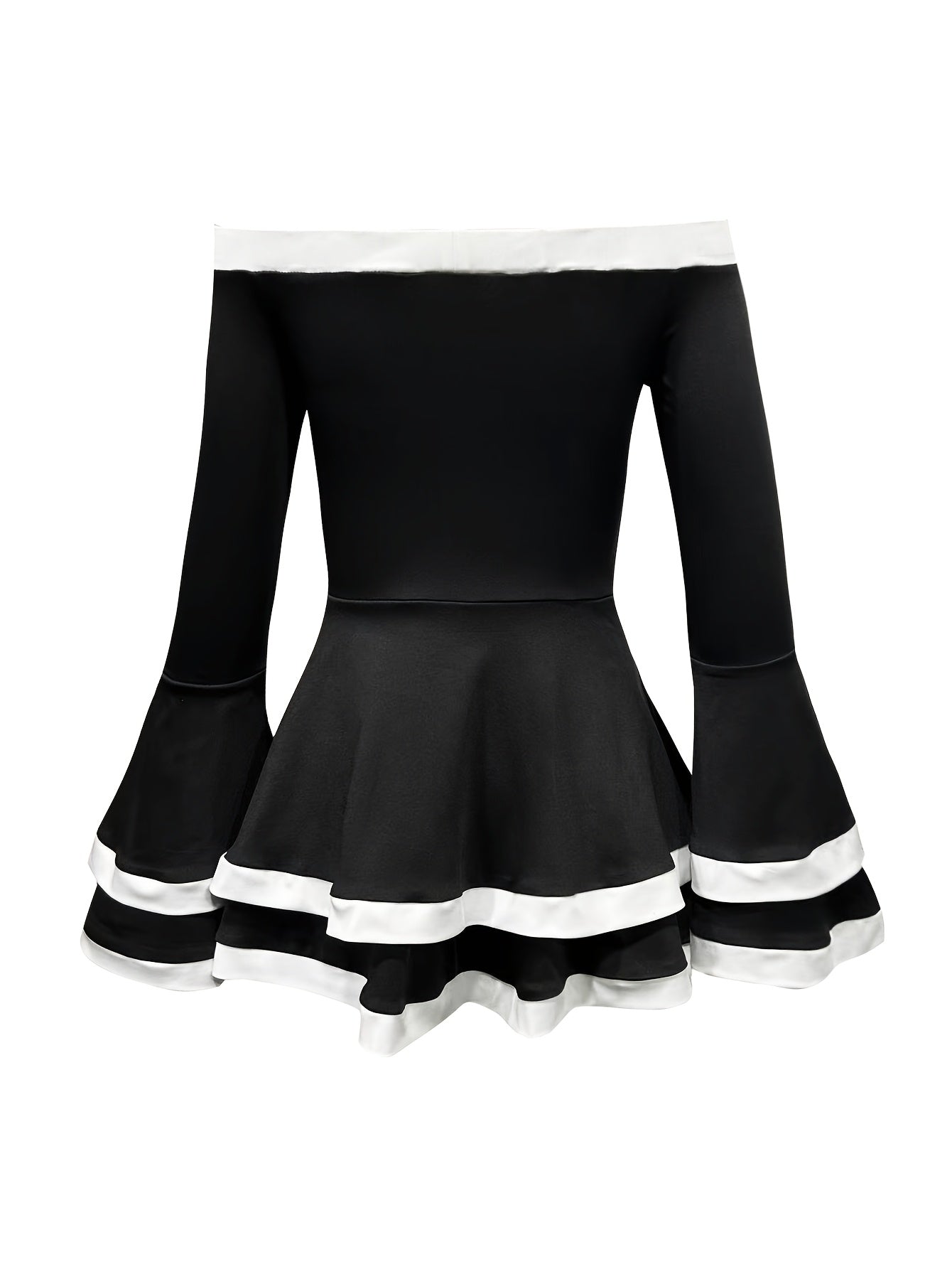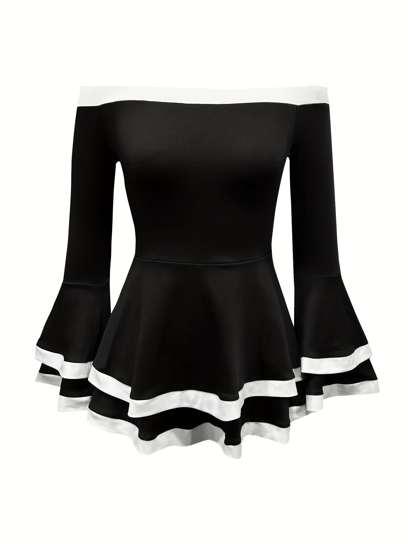 Elegant Off-Shoulder Ruffle T-Shirt for Women - Color Block, Stretchy Polyester Blend, Machine Washable - Perfect for Spring & Fall