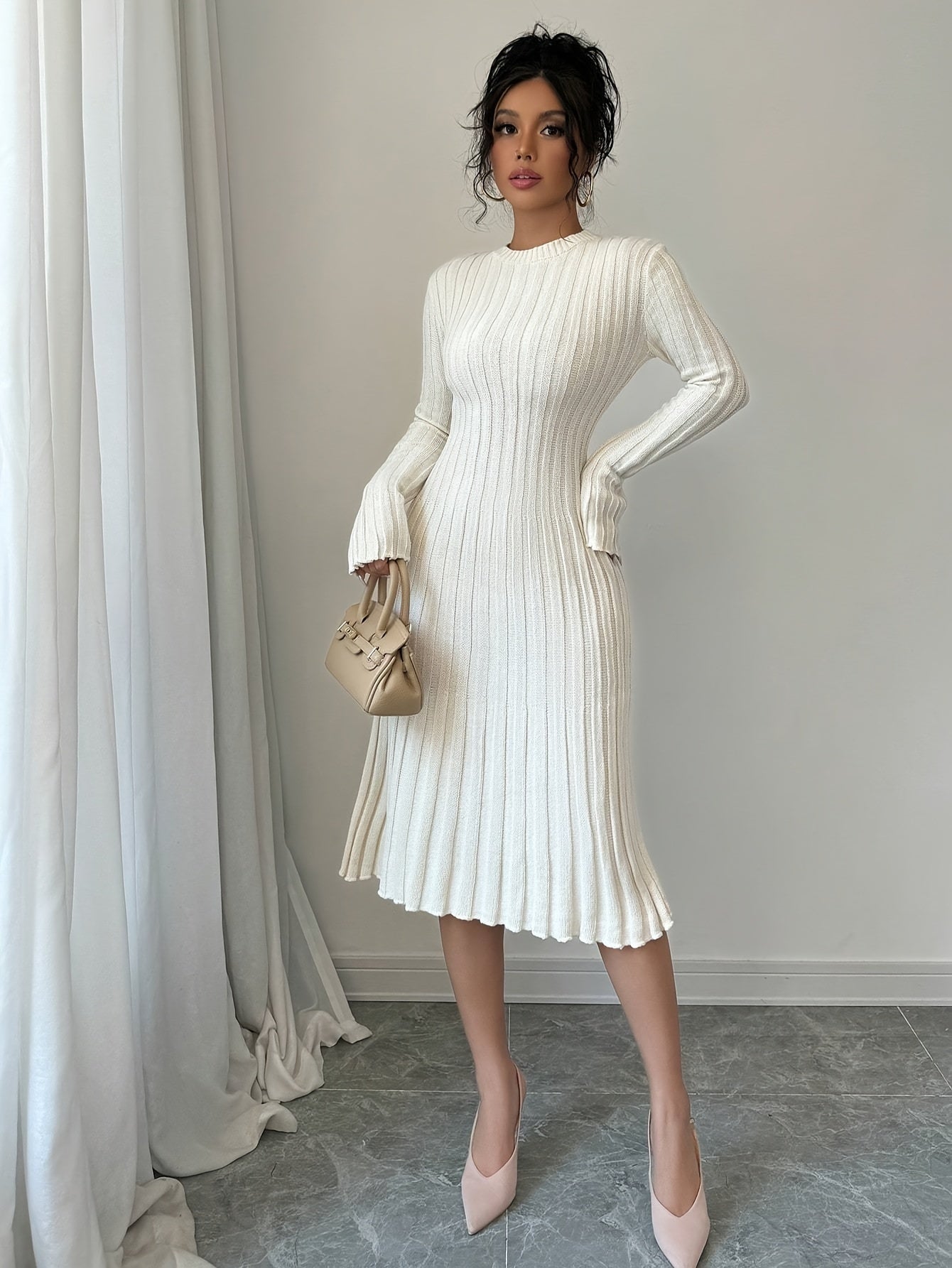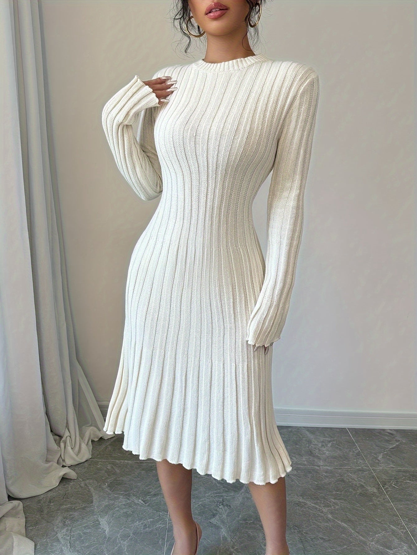 Elegant Solid Color Ribbed Knit Sweater Dress for Women - Crew Neck, Long Sleeve, Pleated Design, Perfect for Fall & Winter
