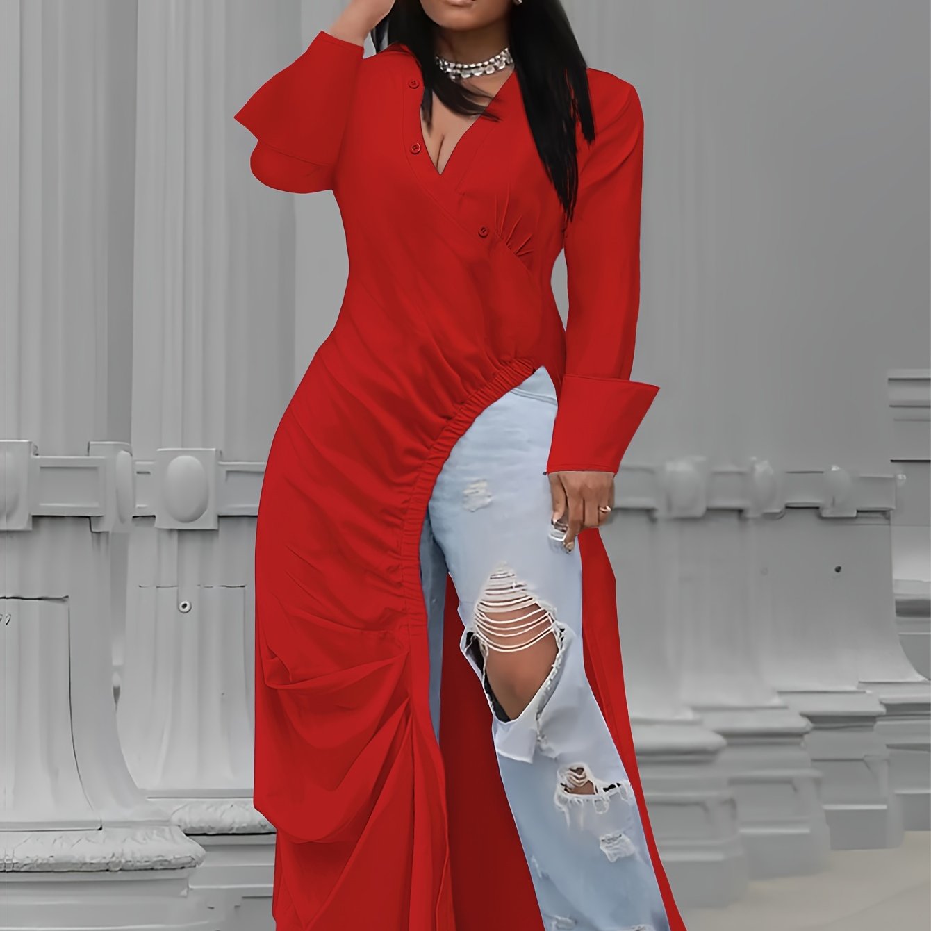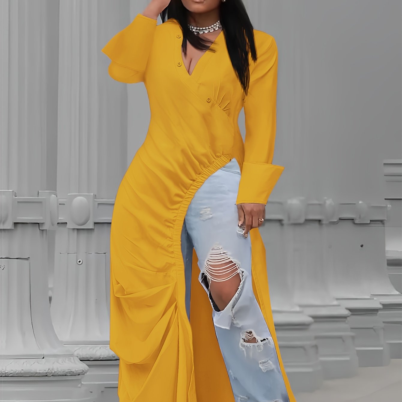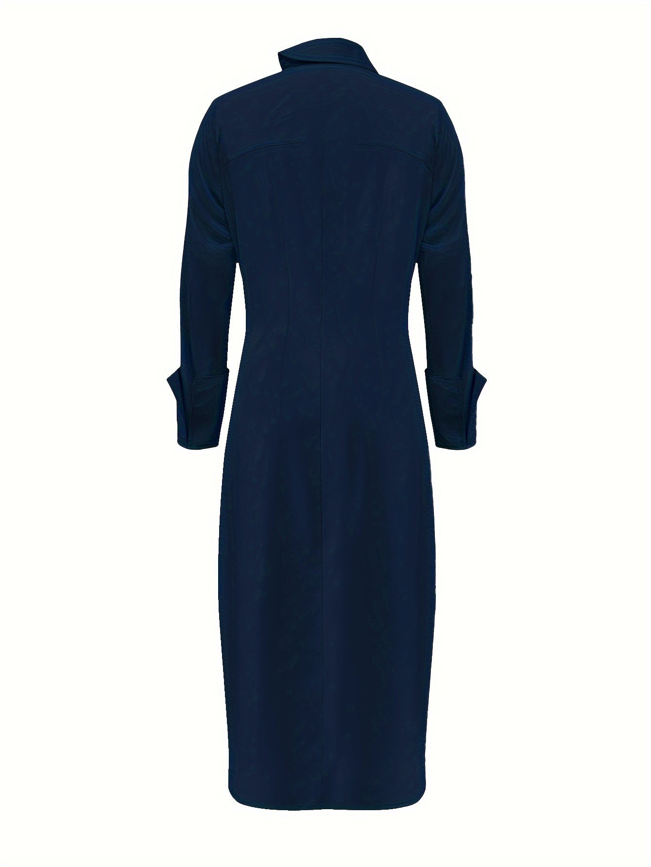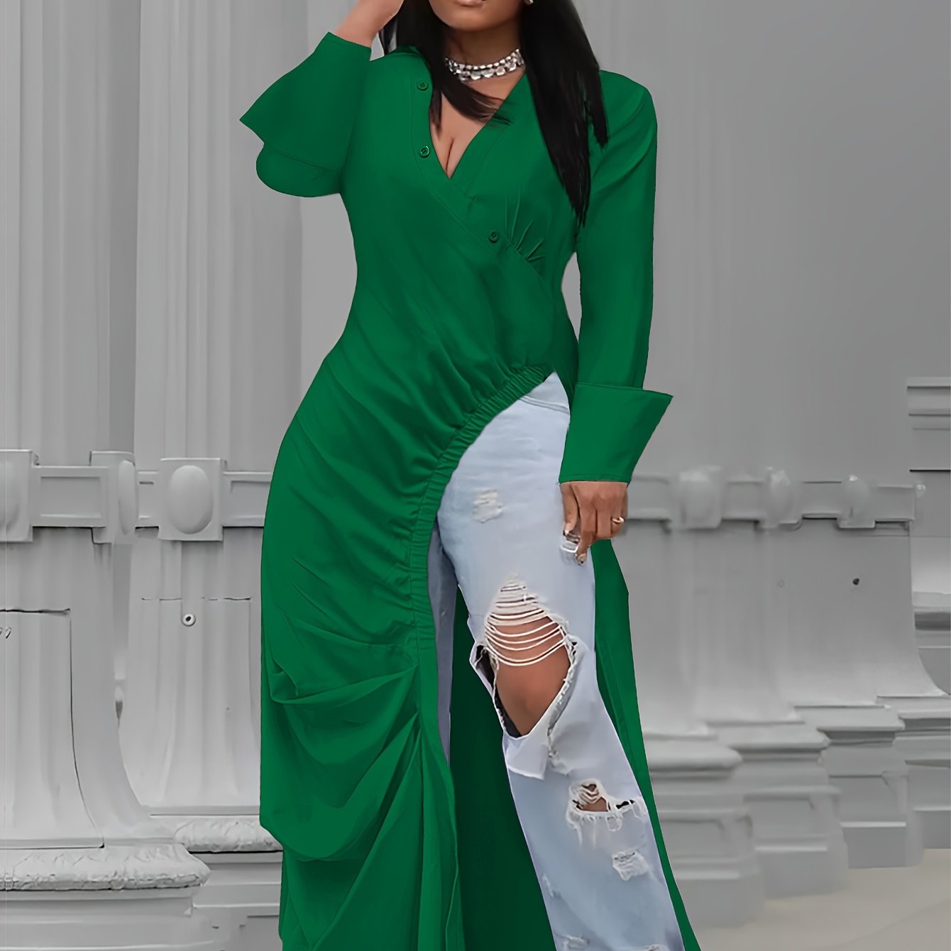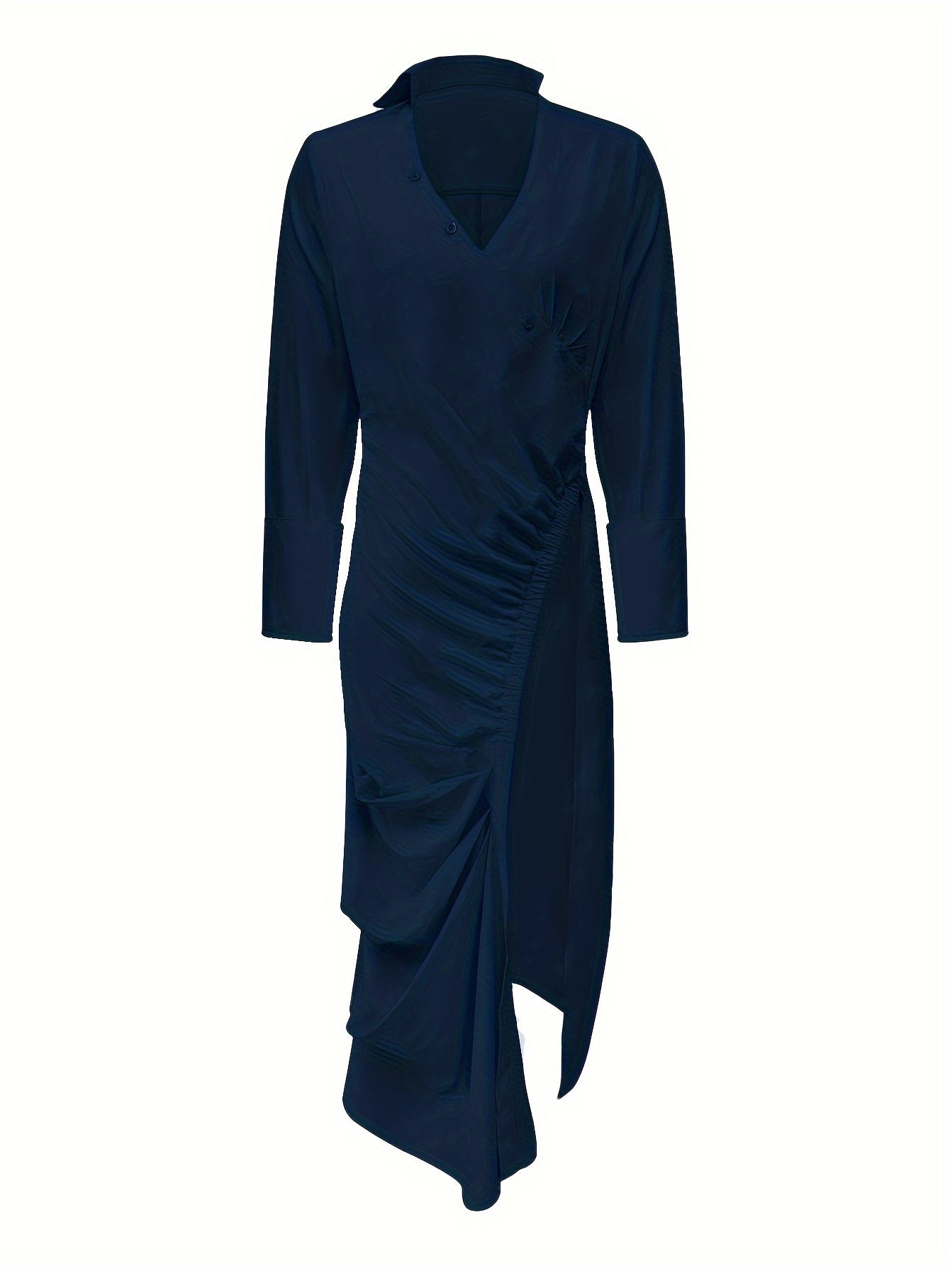 [Elegant Style] Women's Elegant Navy Blue Long Sleeve Top with V-Neck and Ruched Detail - Stylish Maxi Length, Polyester, Machine Washable