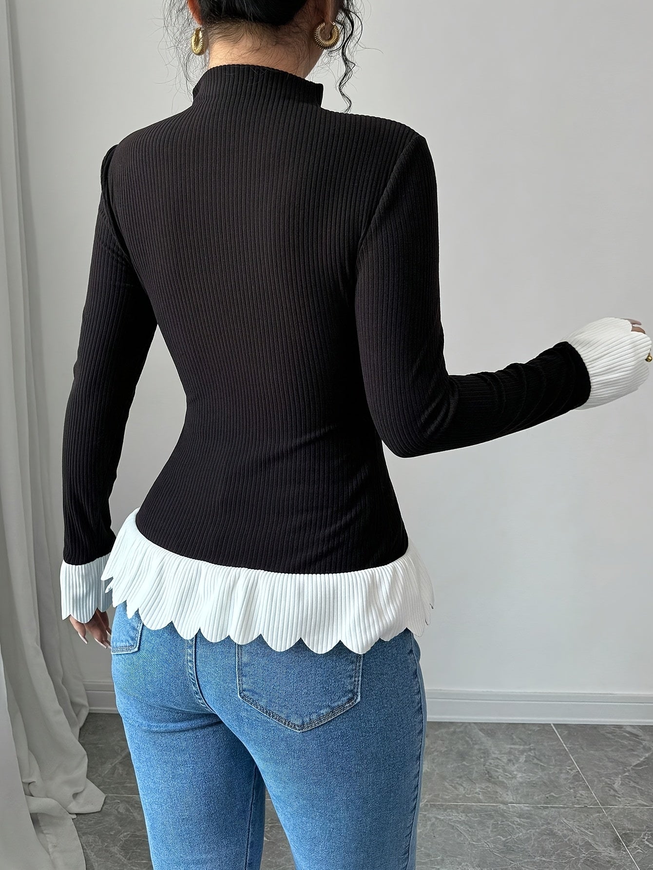 Elegant Women's Color Block High-Neck T-Shirt with Asymmetrical Hem - Long Sleeve, Ribbed Knit, Machine Washable - Black & White, Spring/Fall Casual Chic, Spring Fall Fashion | Ruffle Detail Shirt | Quality Stitching