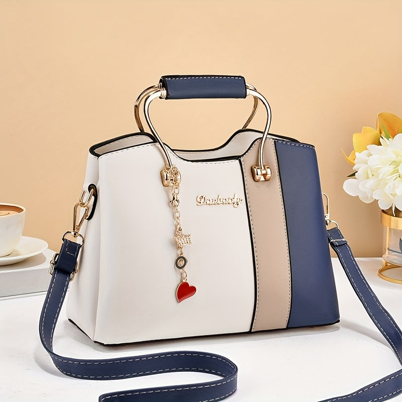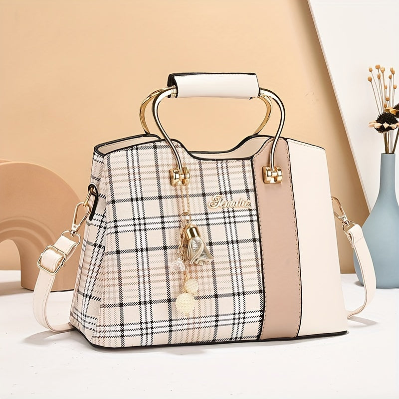 Elegant Women'S Plaid Handbag - Removable Shoulder Straps & Zipper Closure, Black Golden Jewelry, Charming Pendants & Oil-Edged Decoration, Casual Formal Dual-Purpose Retro Shoulder Bag, Durable Structure, Polyester Lining, Synthetic, Casual Shoulder Bag
