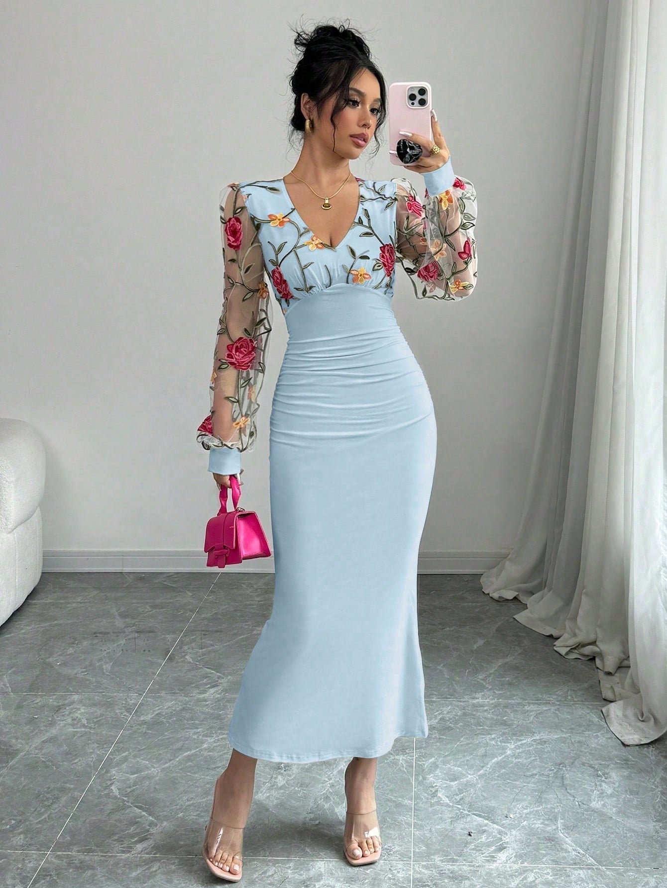 Elenzga 1pc Women's V-Neck Floral Embroidery Mesh Contrast Ruched Elegant Long Sleeve Dress Maxi Women Outfit