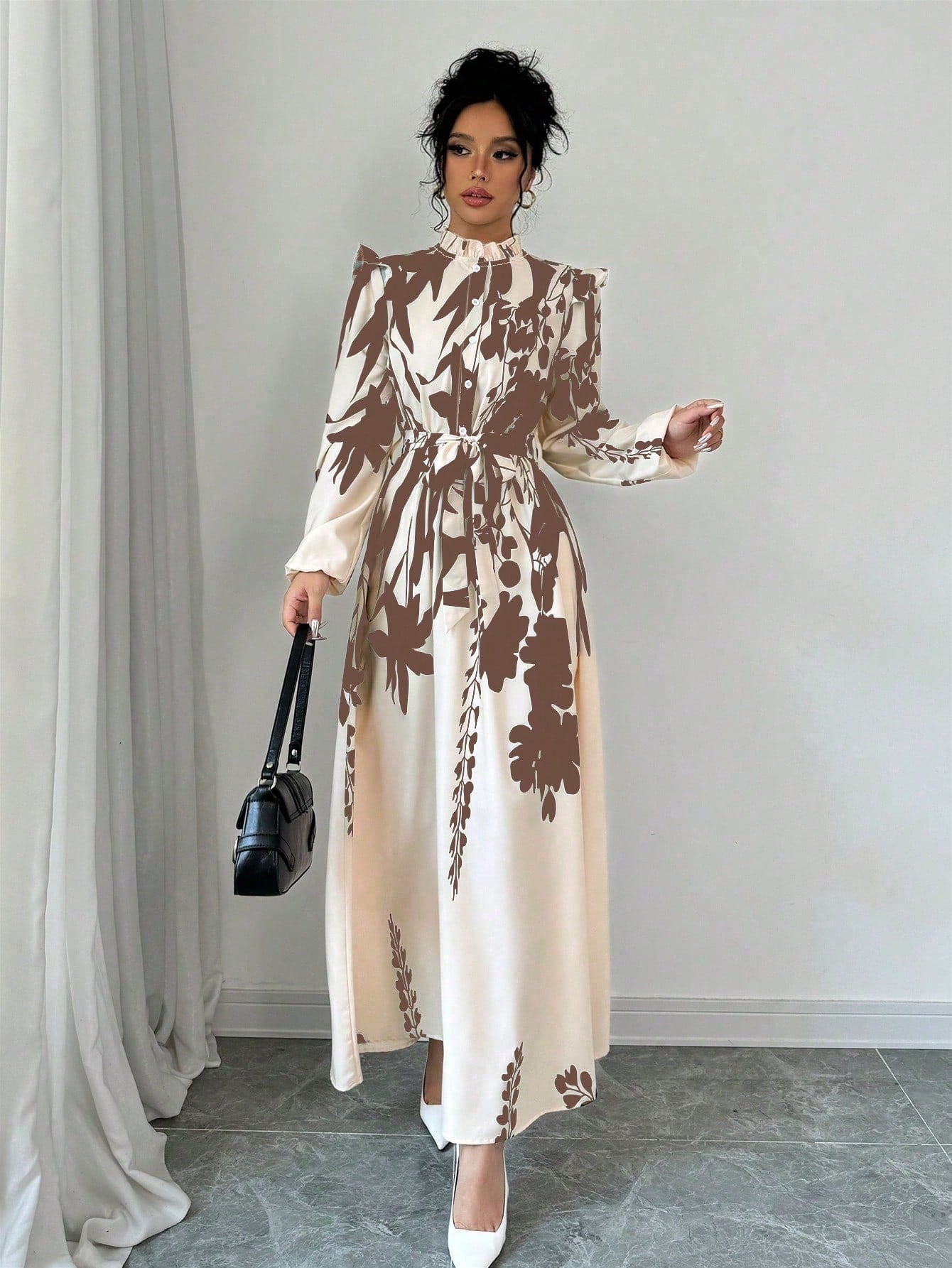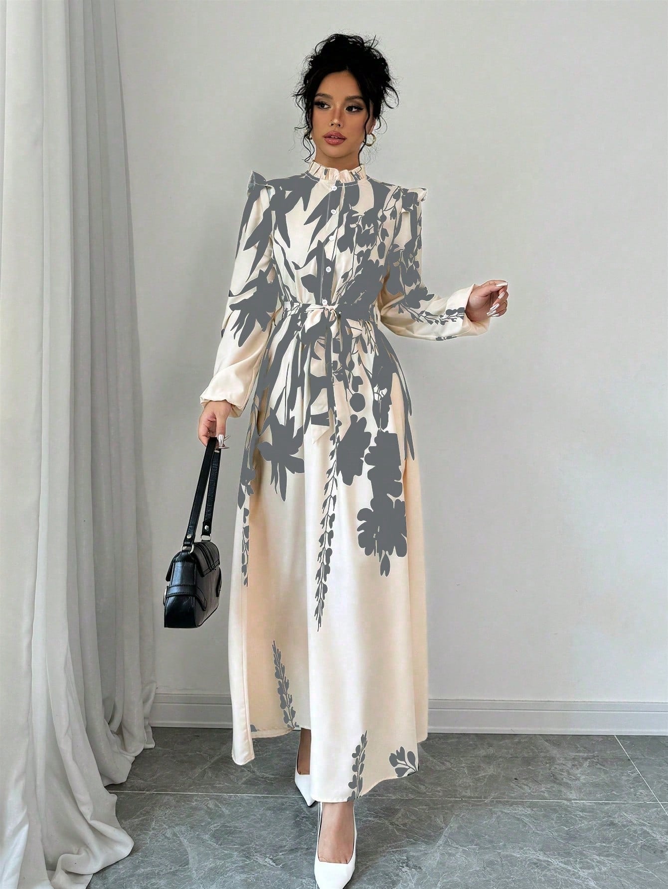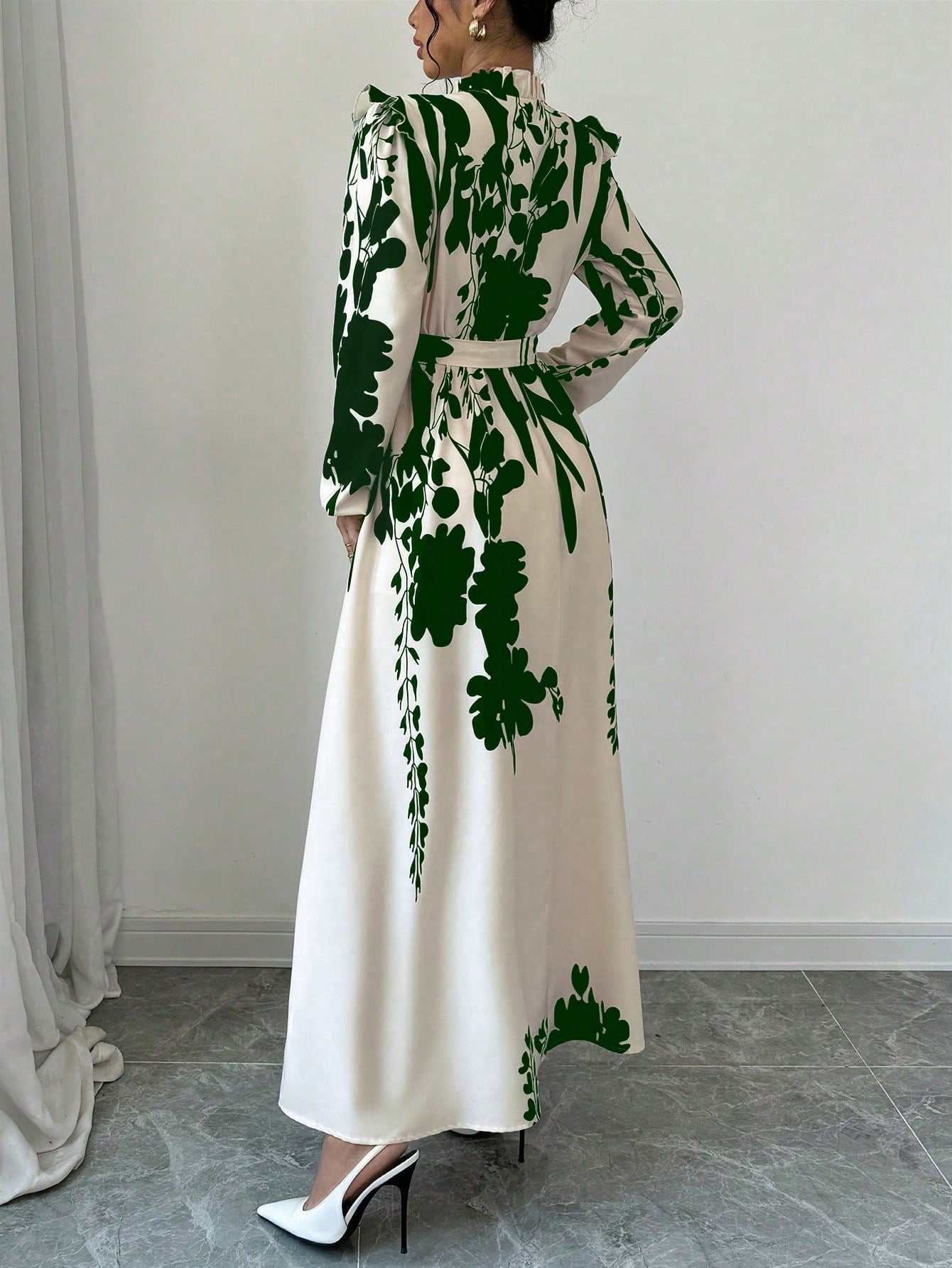 Elenzga Women's Elegant Plant Print Cinched Waist Long Dress For Autumn Maxi Women Outfit