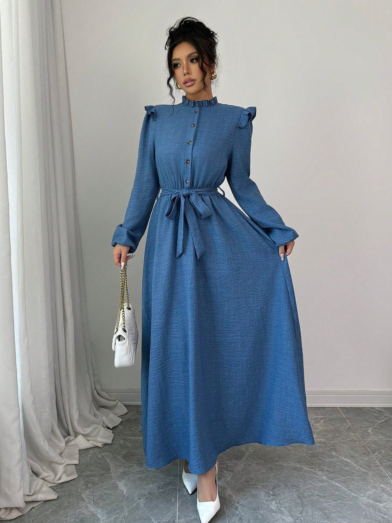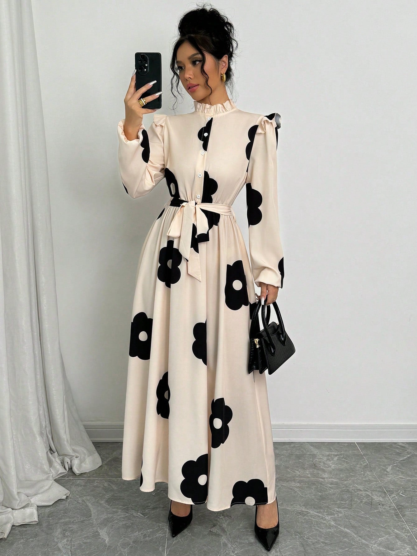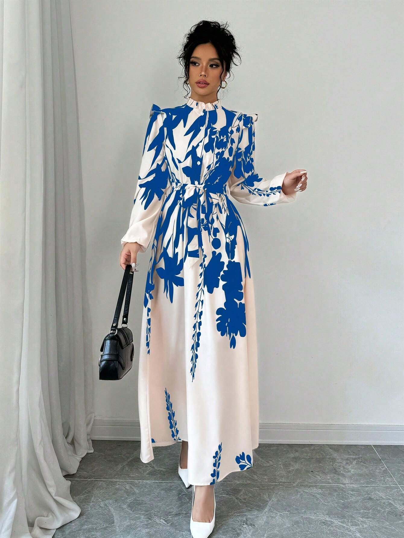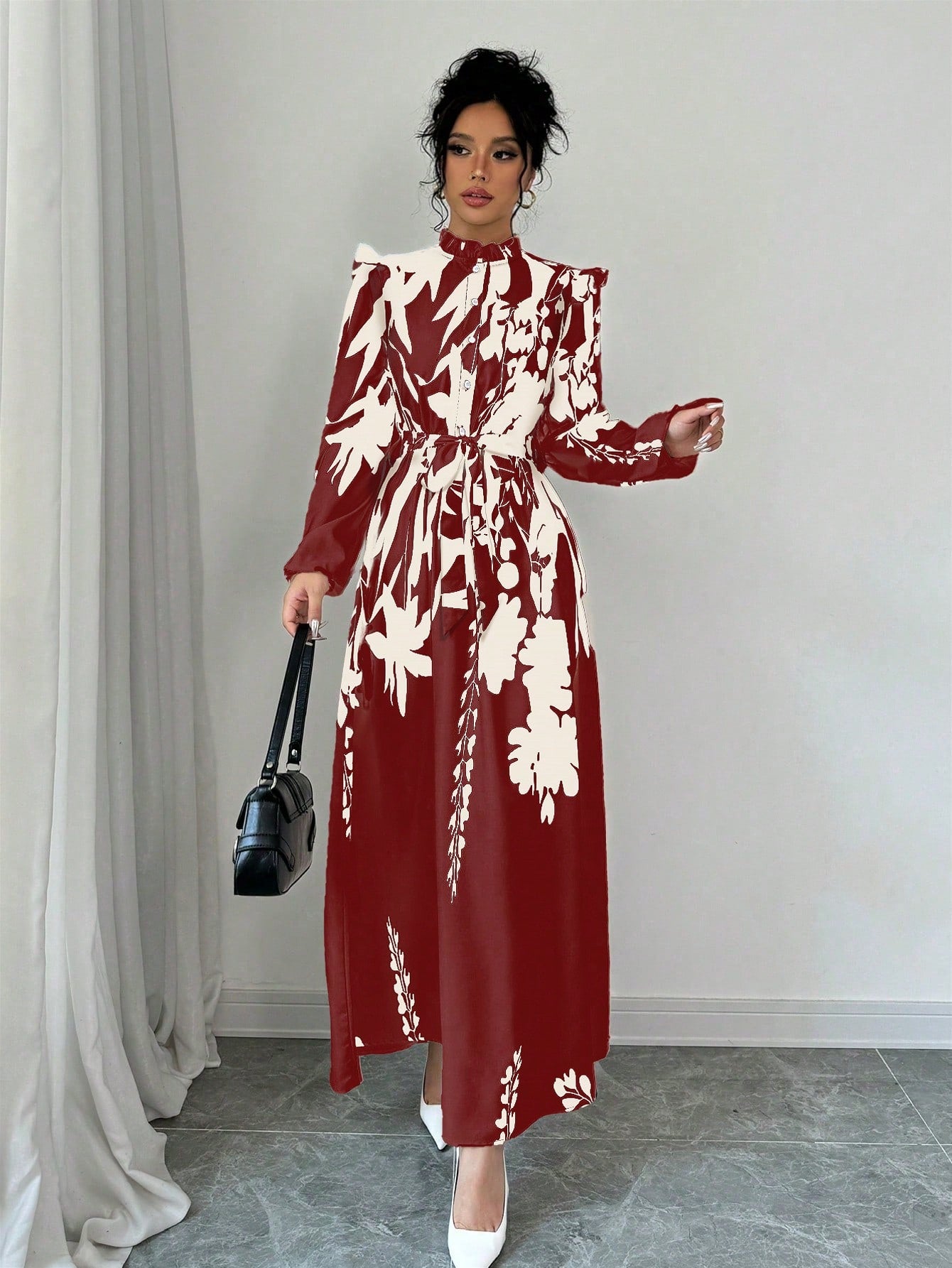 Elenzga Women's Elegant Plant Print Cinched Waist Long Dress For Autumn Maxi Women Outfit