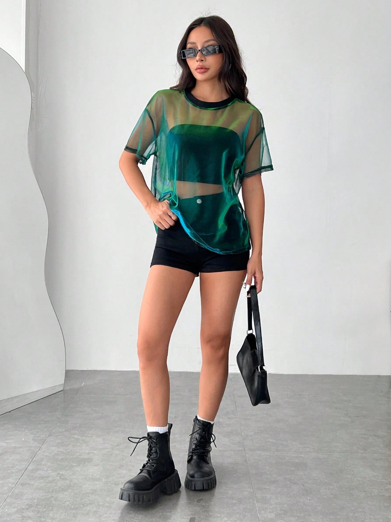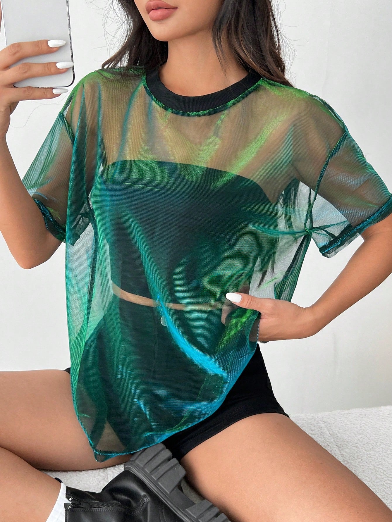 EZwear Multicolor Mesh Contrast Sheer Women's Short Sleeve T-Shirt