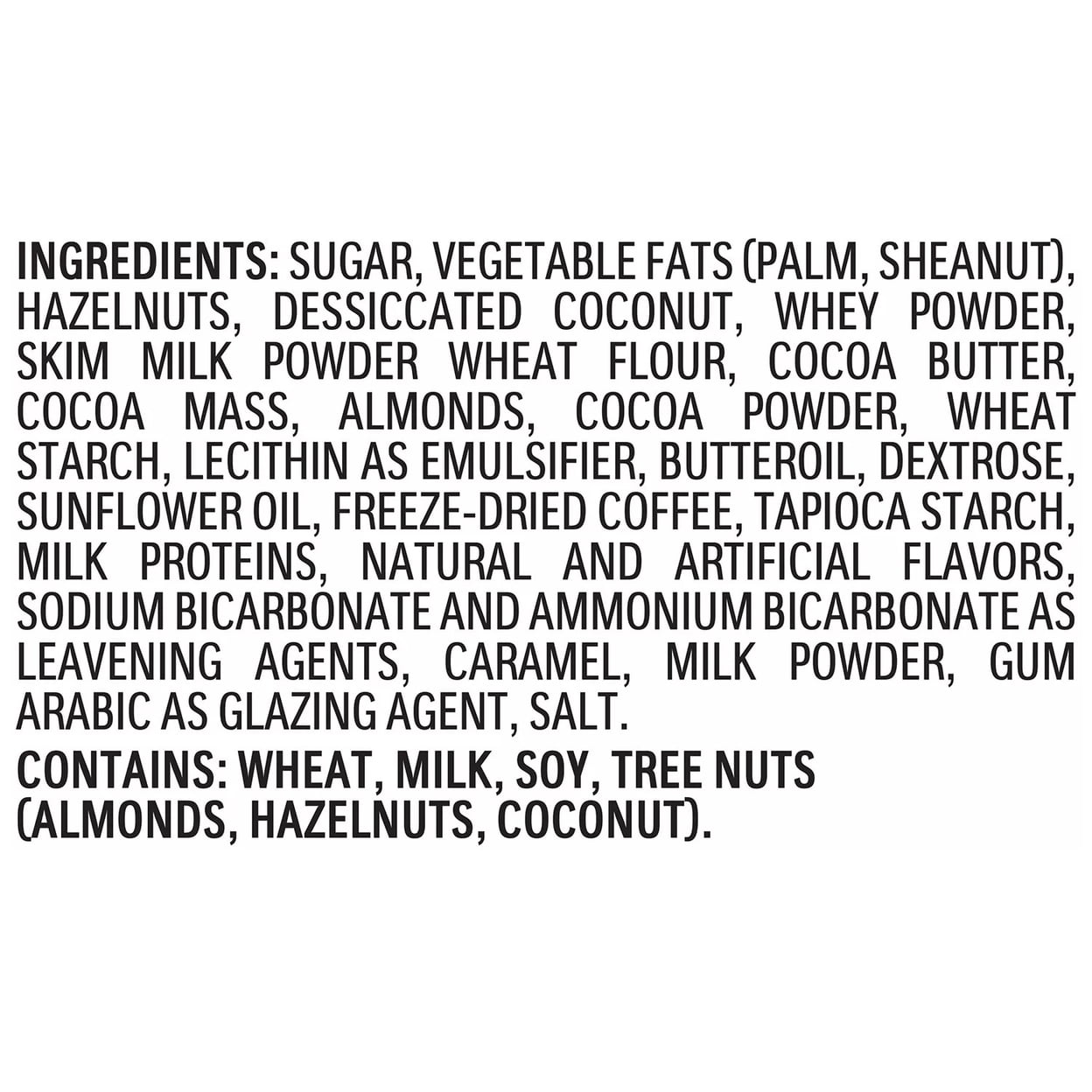 - Contains Wheat, Milk, Soy and Tree Nuts Almonds, Hazelnuts, Coconuts