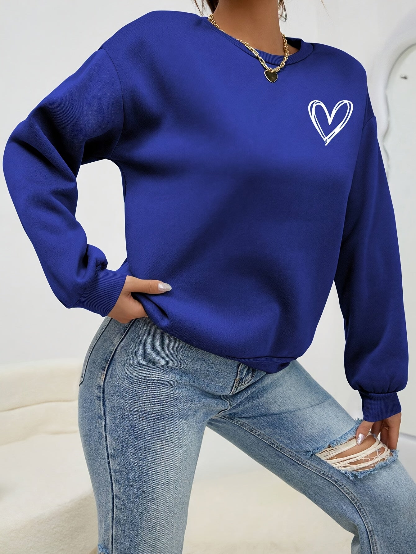 For Fall & Winter, Casual Long Sleeve Crew Neck Heart Print Pullover Sweatshirt, Women's Clothing, Drop Shoulder