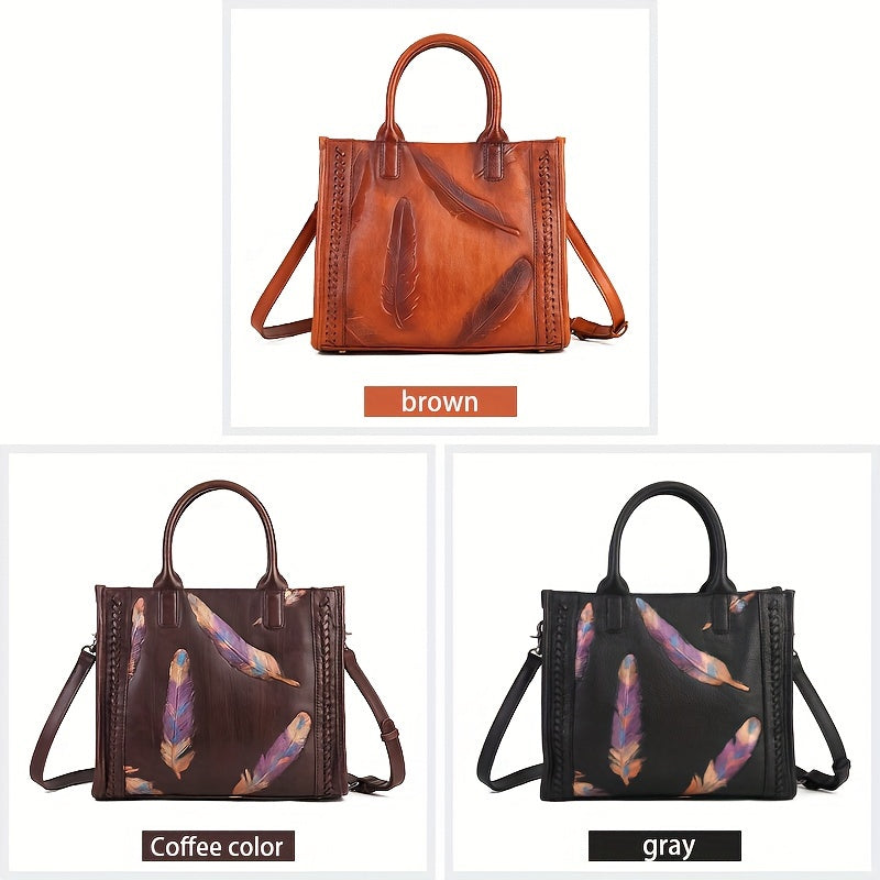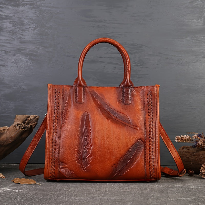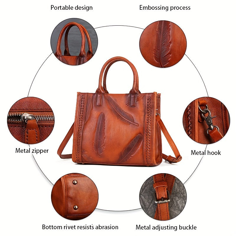 Genuine Leather Women'S Bag, Top Layer Cowhide, Retro Small Square Bag, Feather Embossed, High-end Handbag