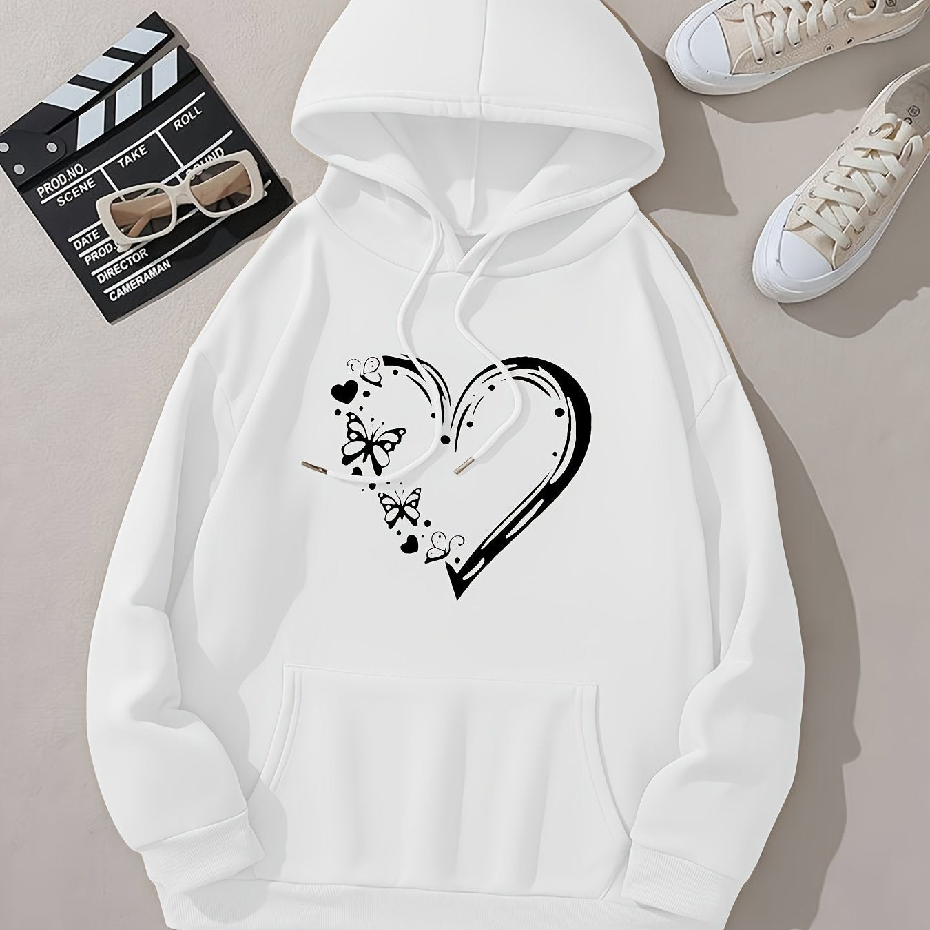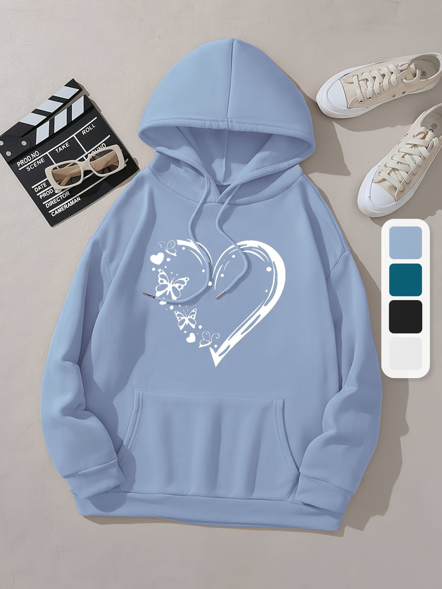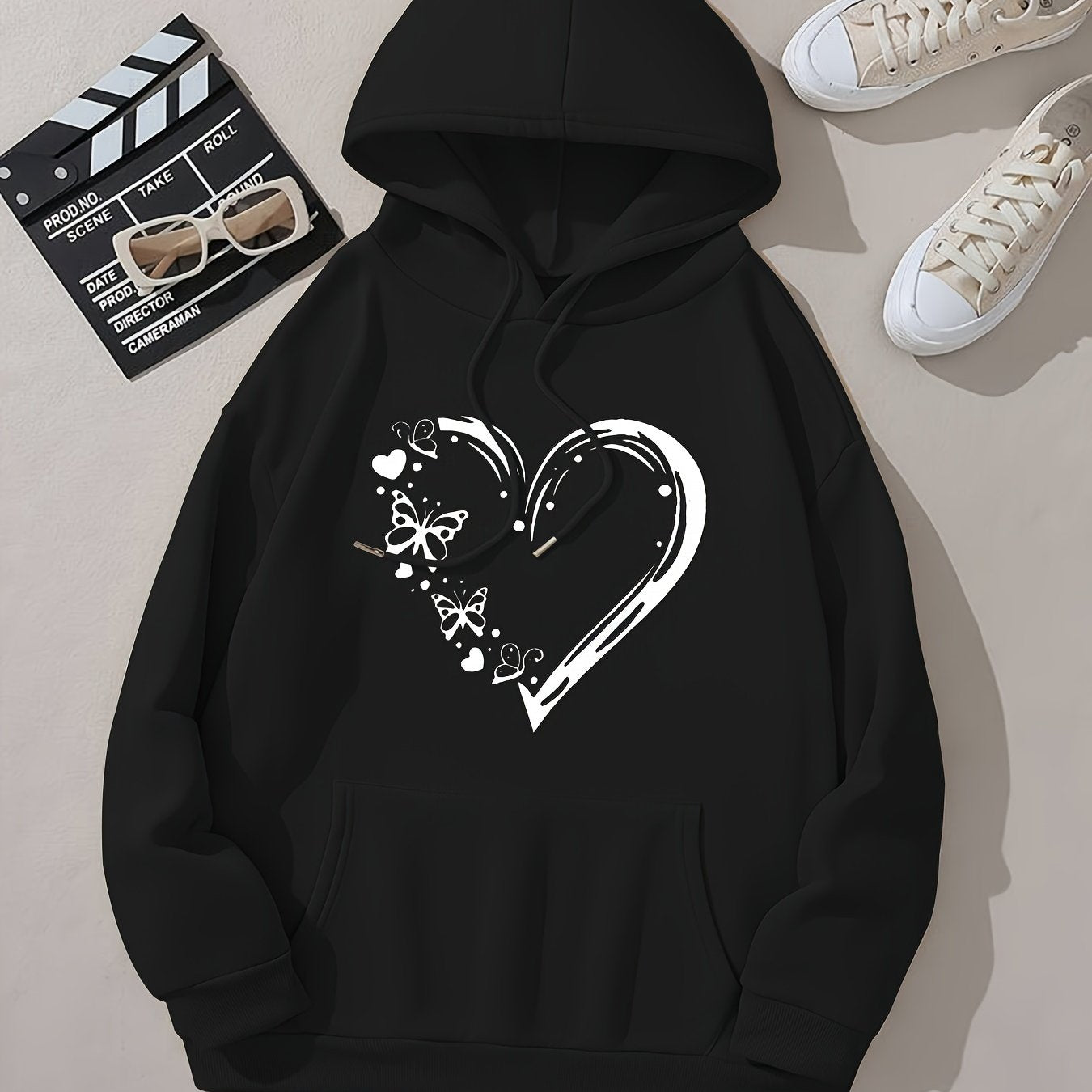 Heart & Butterfly Print Long Sleeve Hooded Sweatshirt With Kangaroo Pockets, Women's Sportswear For Fall & Winter, Outdoor Wear