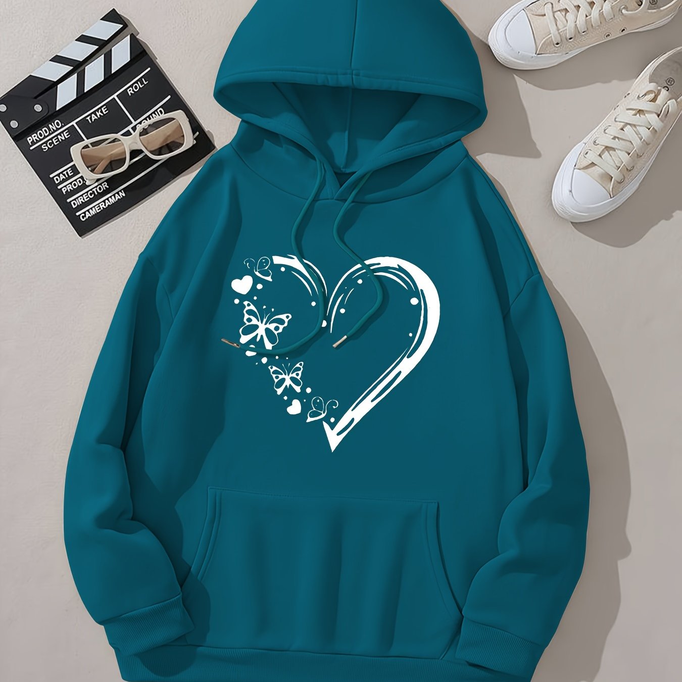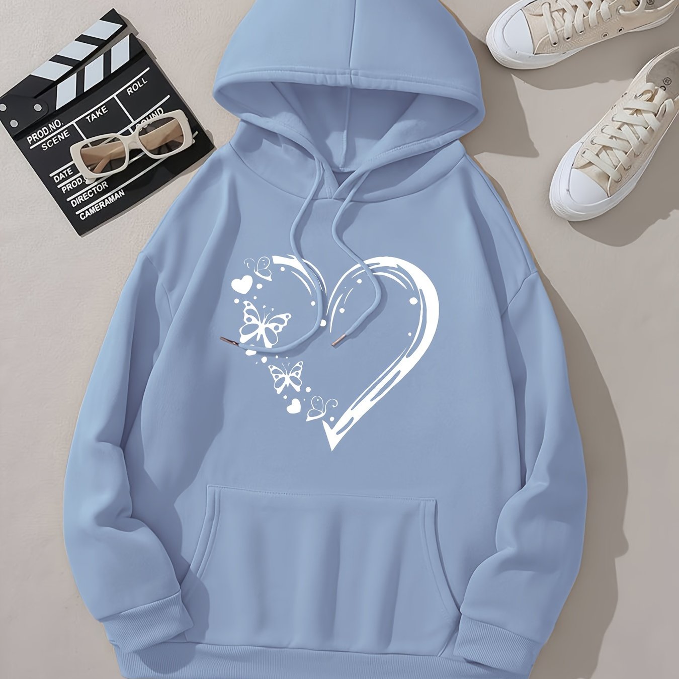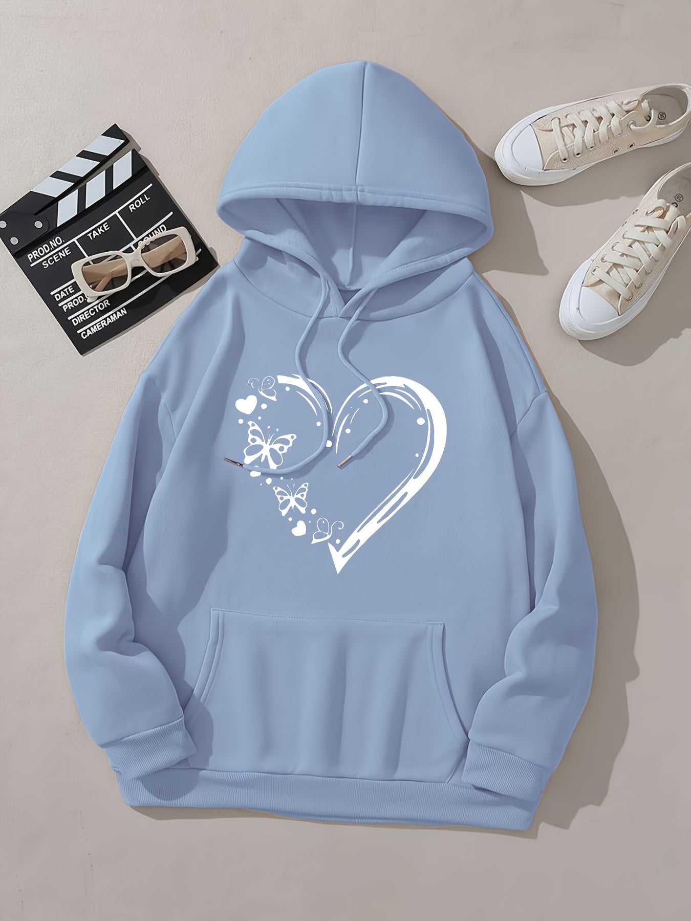 Heart & Butterfly Print Long Sleeve Hooded Sweatshirt With Kangaroo Pockets, Women's Sportswear For Fall & Winter, Outdoor Wear