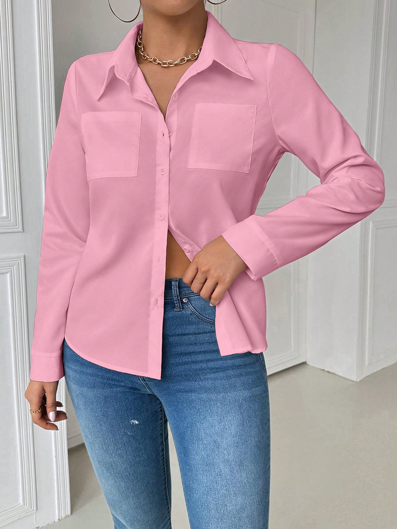 INAWLY Casual Collared Pocket Fitted Long Sleeve Women Blouse Women Shirt
