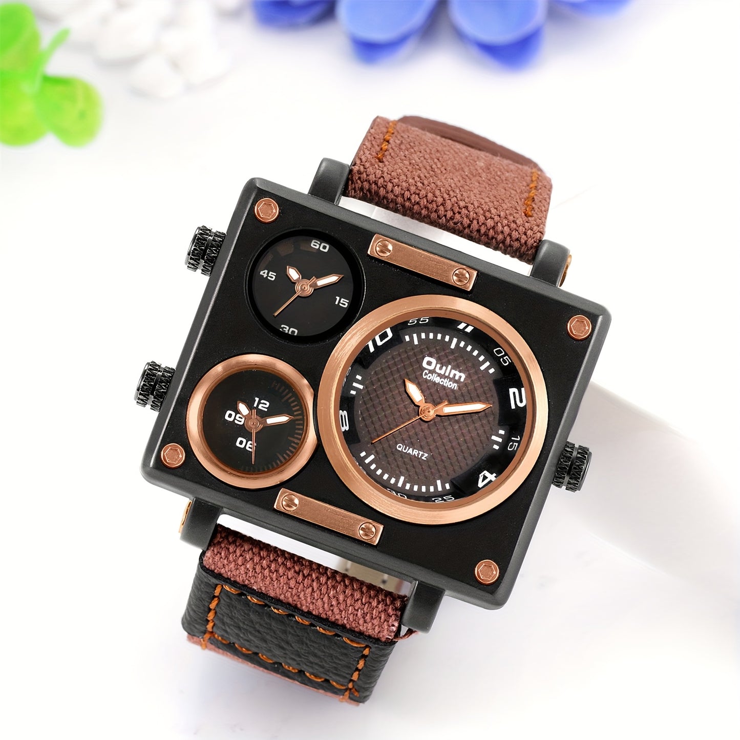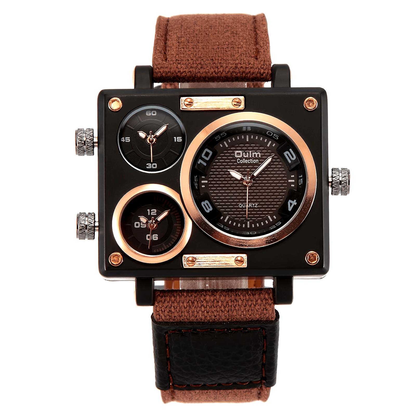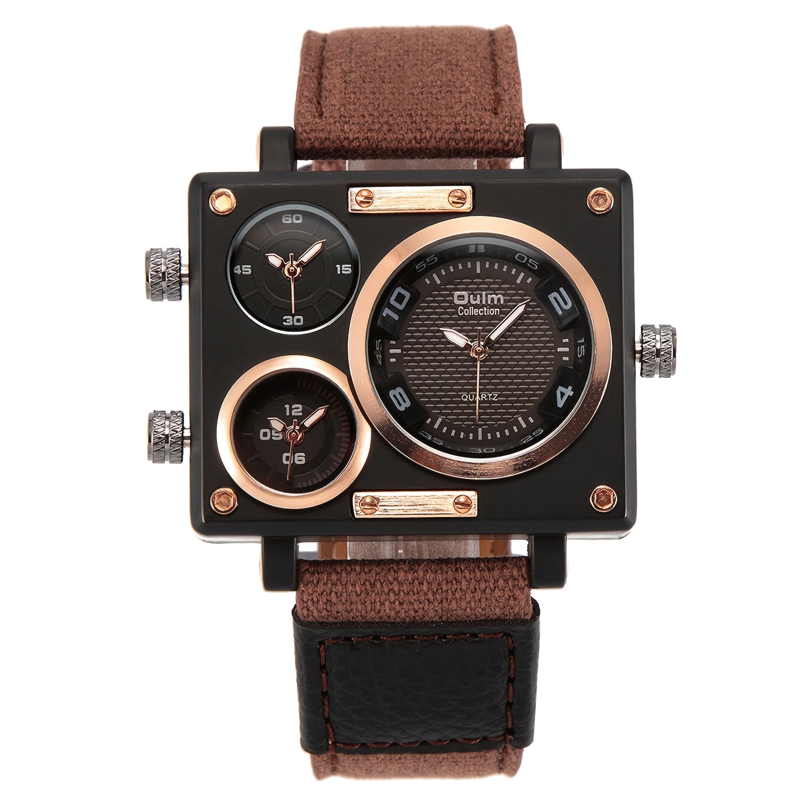 Jewelrywe Mens Large Square Dial Watch Multi Time Zone Faux Leather Strap Quartz Wristwatch