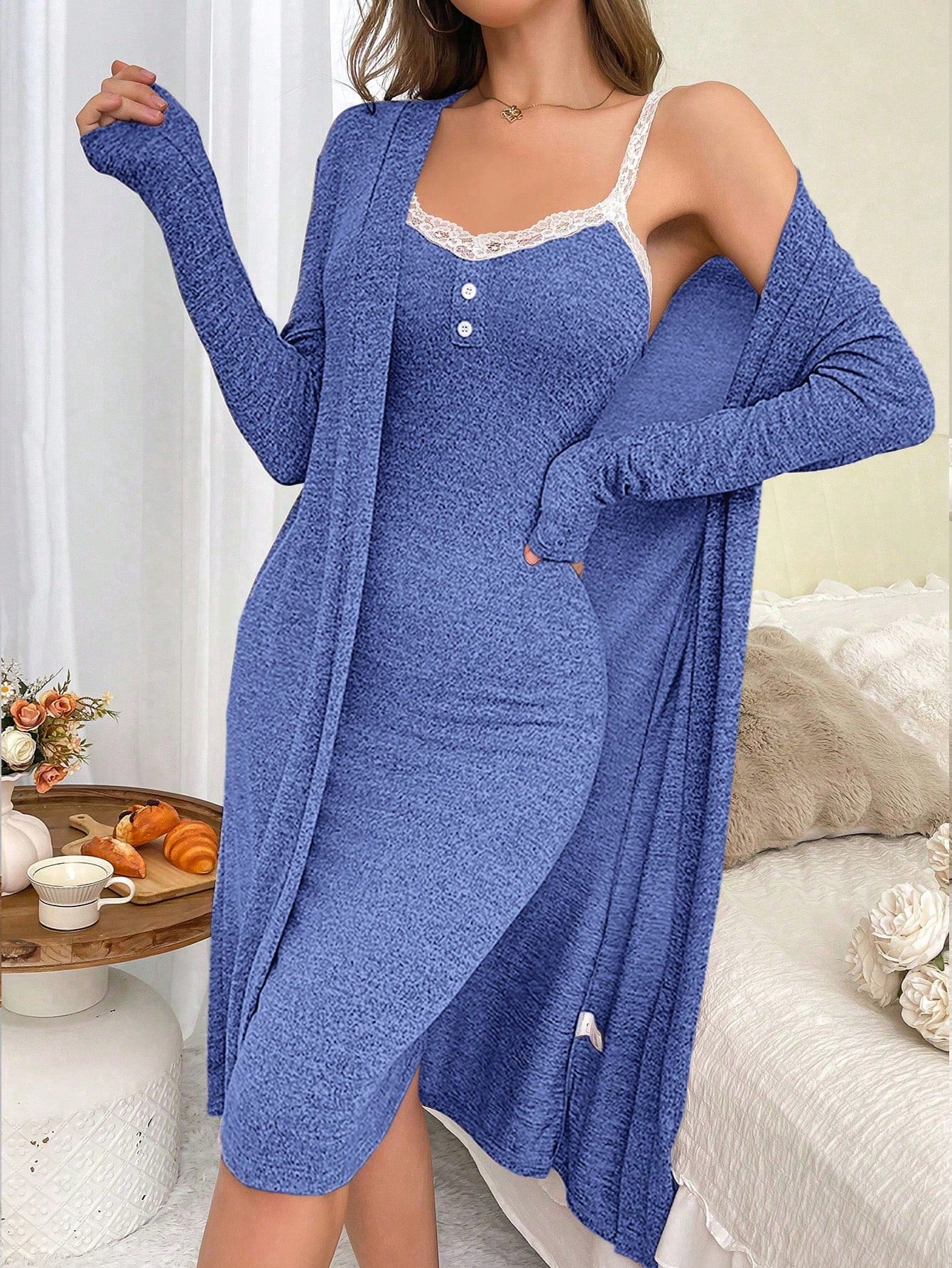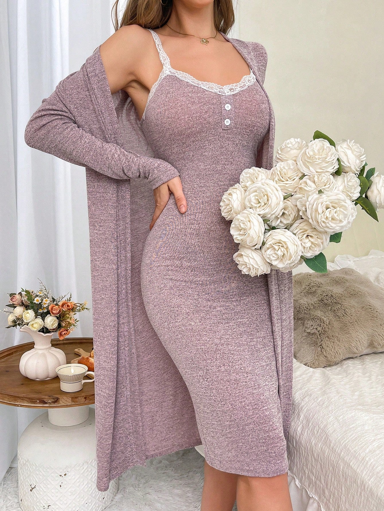 Ladies Casual Elegant Contrast Lace Camisole Nightgown With Cover-Up Cardigan Sleep Set, For Autumn